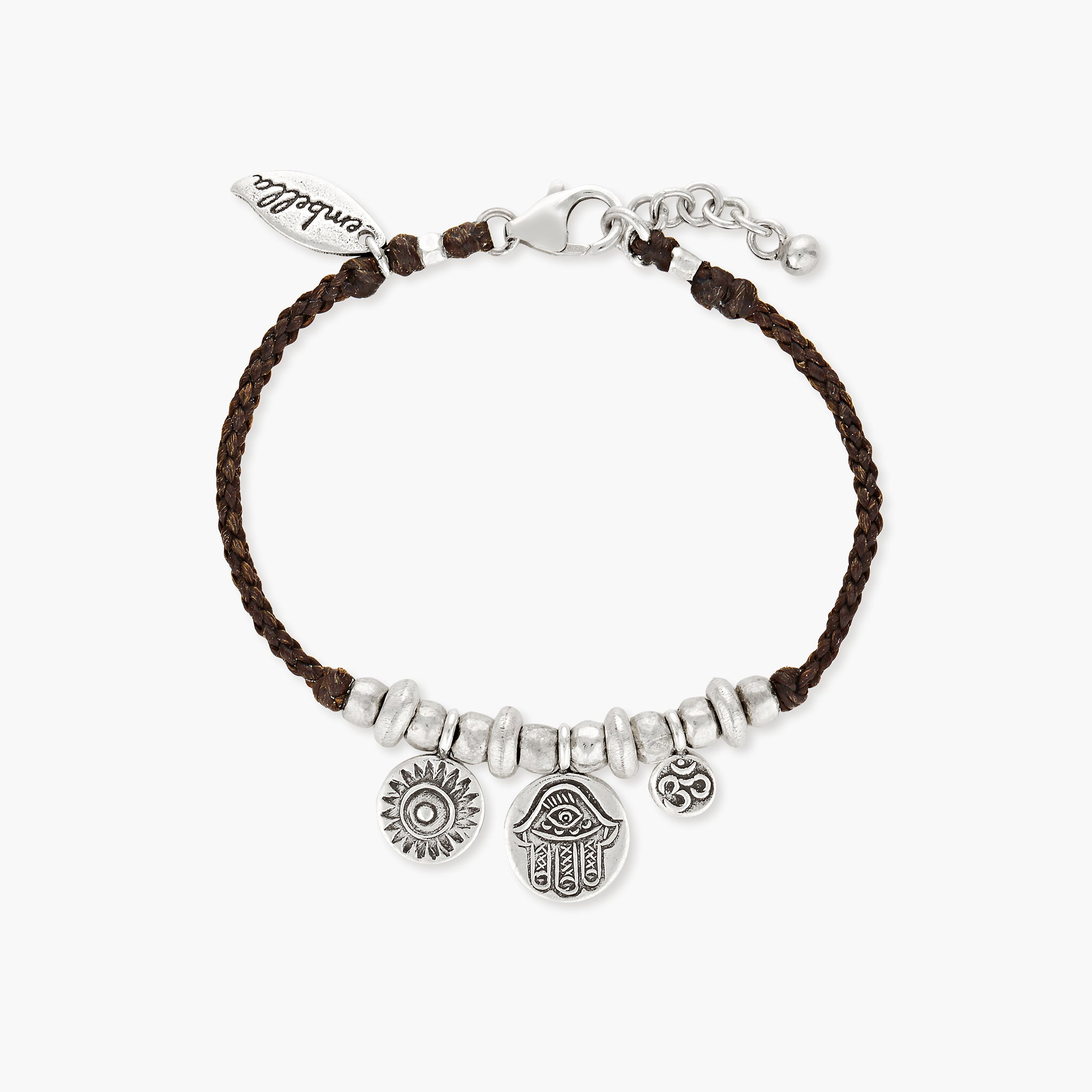 Introducing the Hamsa Bracelet, a meaningful accessory that combines elegance and spirituality. Crafted with durable Polywax cotton thread, this bracelet is adorned with Hill Tribe Silver beads and secured with a sterling silver clasp for a touch of refined quality. The highlight of this bracelet is the trio of pendants: a Hamsa, an Om and a Sun. The Hamsa pendant, an ancient symbol, is believed to bring protection, happiness, and good fortune to the wearer. The open right hand, often with an eye in the centre, is a universal sign of protection against the evil. Accompanying the Hamsa is the Om pendant, representing the sacred sound and spiritual icon in Indian religions, symbolizing the essence of the universe. The Sun pendant adds a touch of radiant energy, symbolising life, vitality and growth.