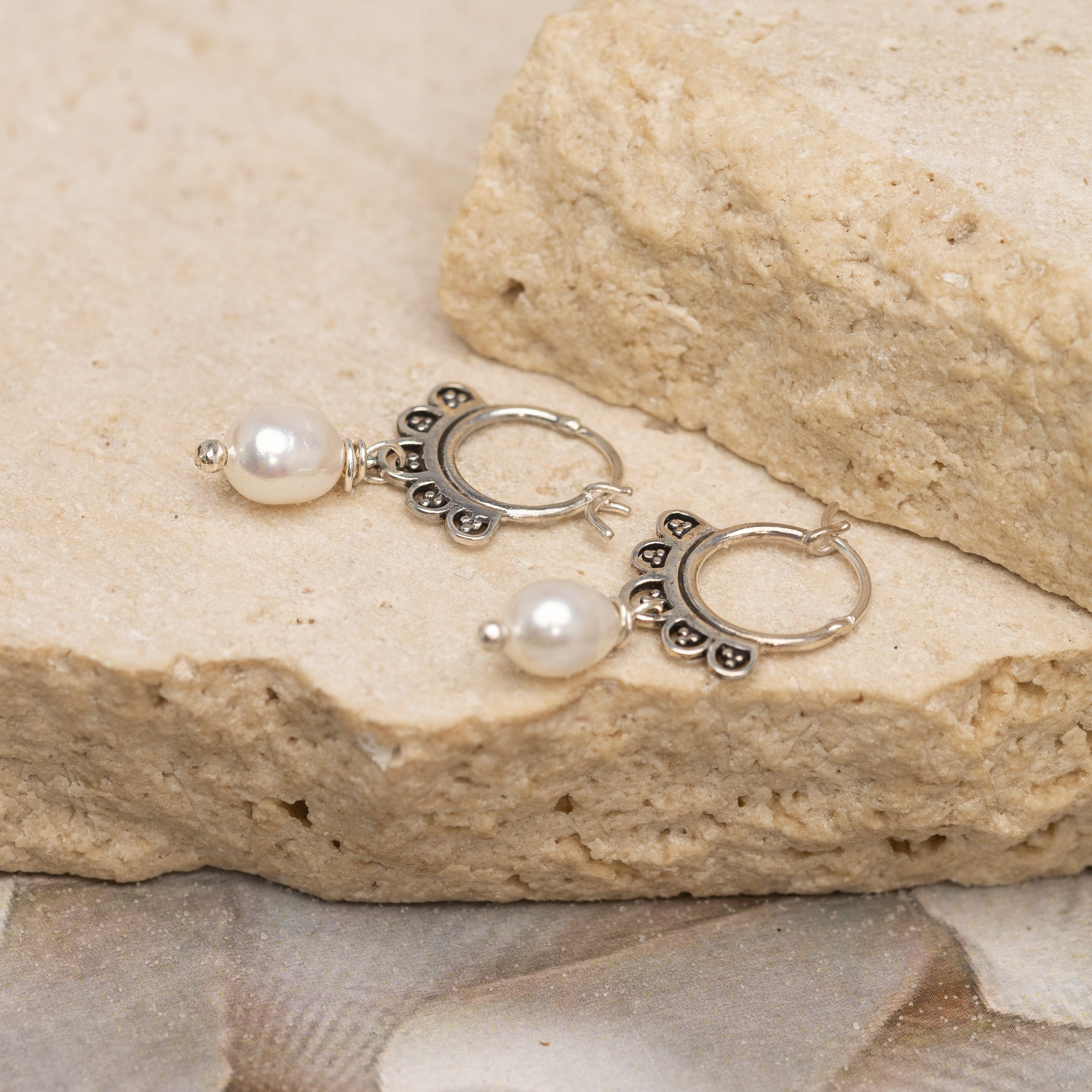 Elevate your style with the ethereal beauty of our Silver Cloudy Hoops with Pearl. Crafted with sterling silver, these hoops exude a sense of timeless elegance. Adorned with lustrous fresh water pearls, they add a touch of sophistication and grace. Let the Silver Cloudy Hoops with Pearl adorn your ears and bring a touch of celestial beauty to any ensemble.