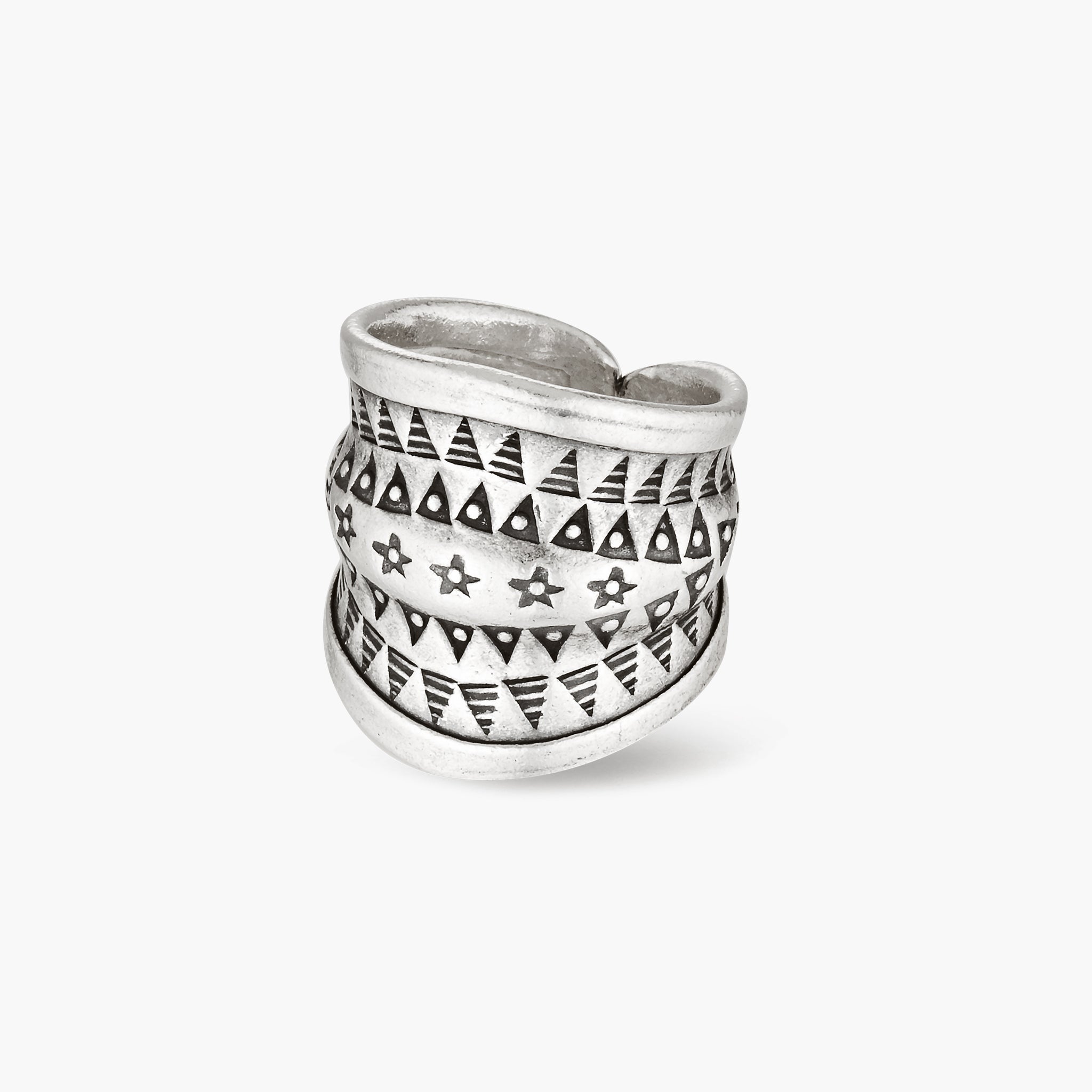Adjustable band at the back of the ring that can be adjusted slightly to fit. Each piece is individually handcrafted therefore can slightly vary in shape and pattern.
