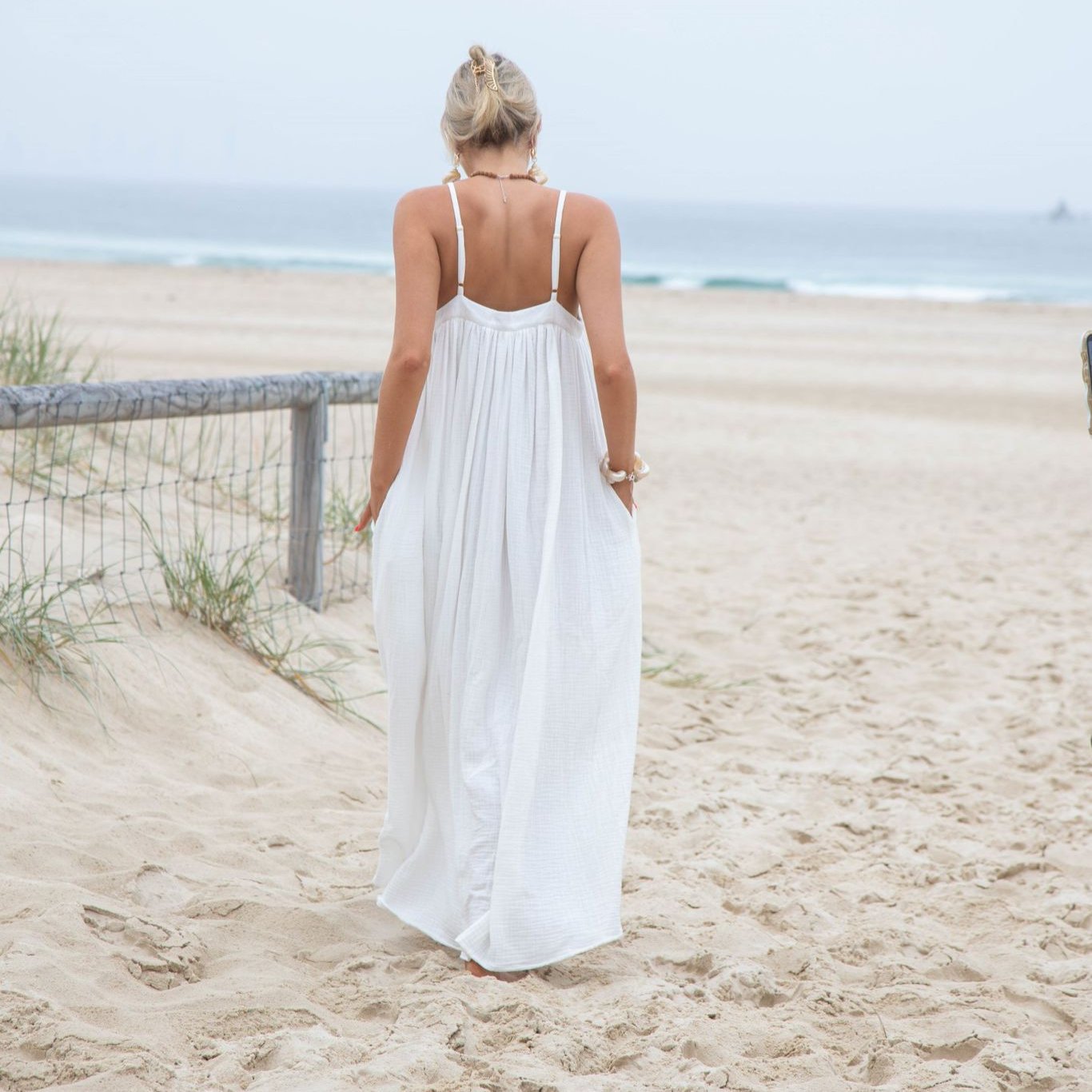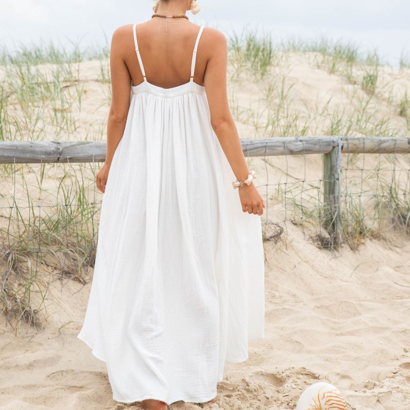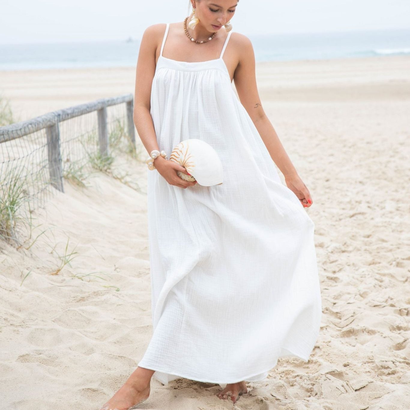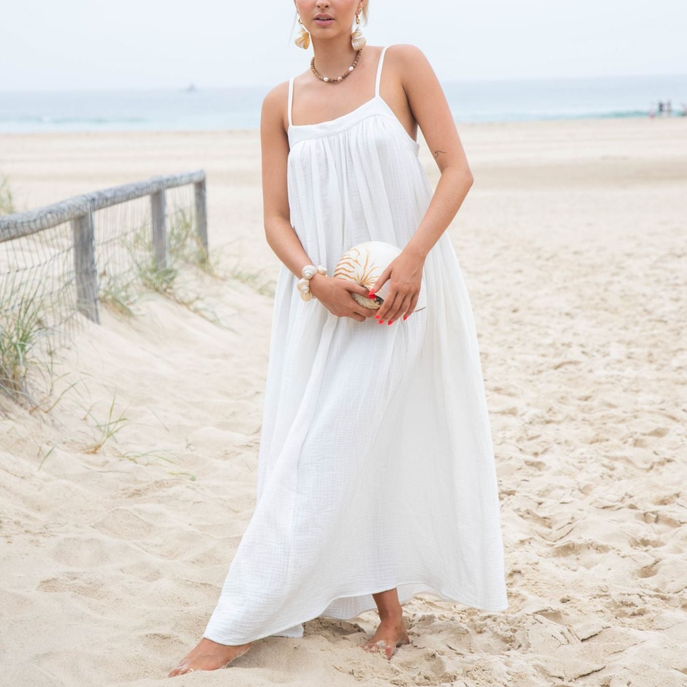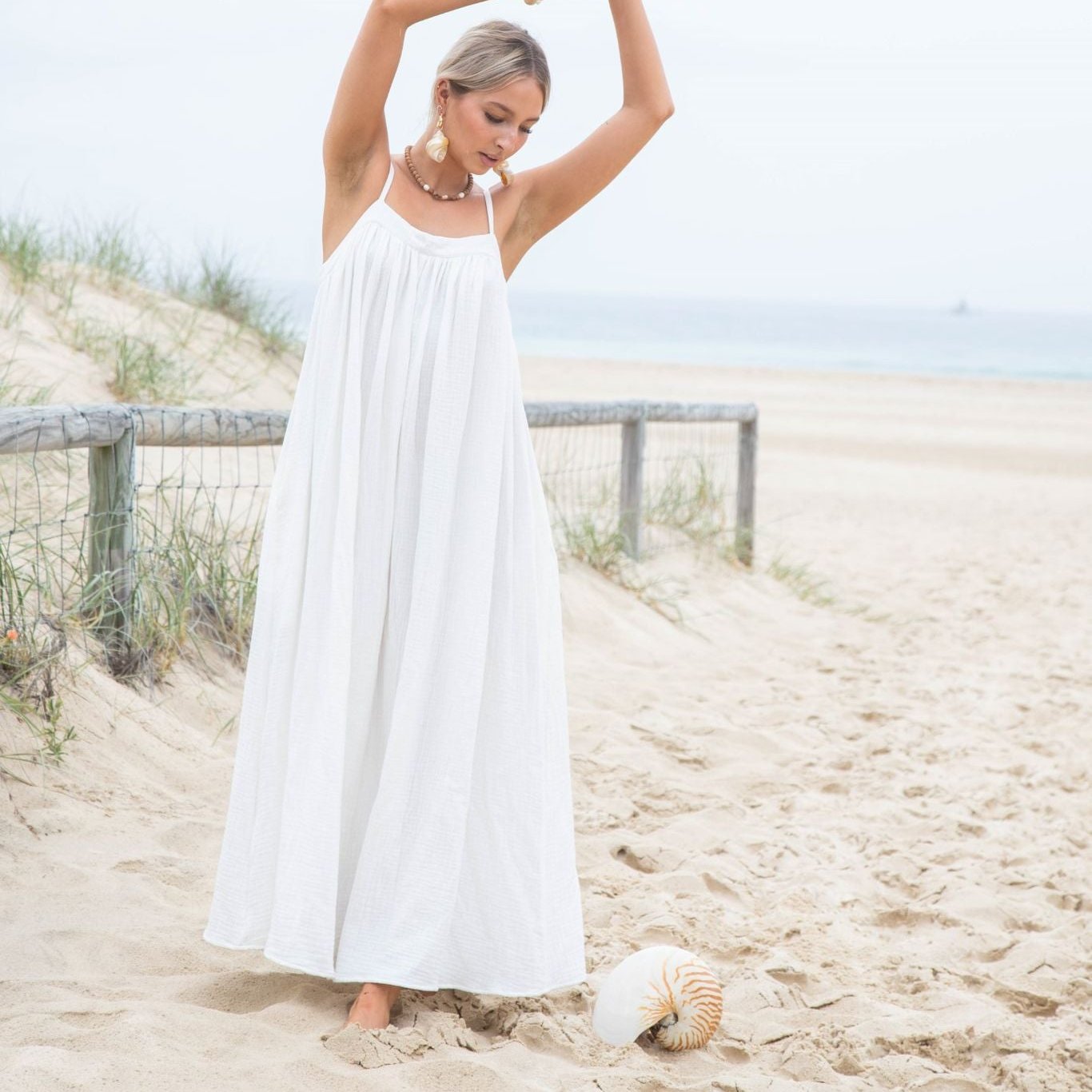 Discover our effortless new mini dress, made for beach side sojourns and endless summer days. The Bay Mini Dress has a square, modest neckline that tapers down around the sides and back. A perfect, flowy beach coverup or chic summer dress.