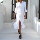 The Maggie is an effortless, casual yet classy dress perfect for days where you need to cover up from the sun and keep cool. This style features unique, contrast stitching, clean, crisp lines with a collared, button down look. The rounded hem softens the cut into your leg line, and side slits help further expose that leg line.