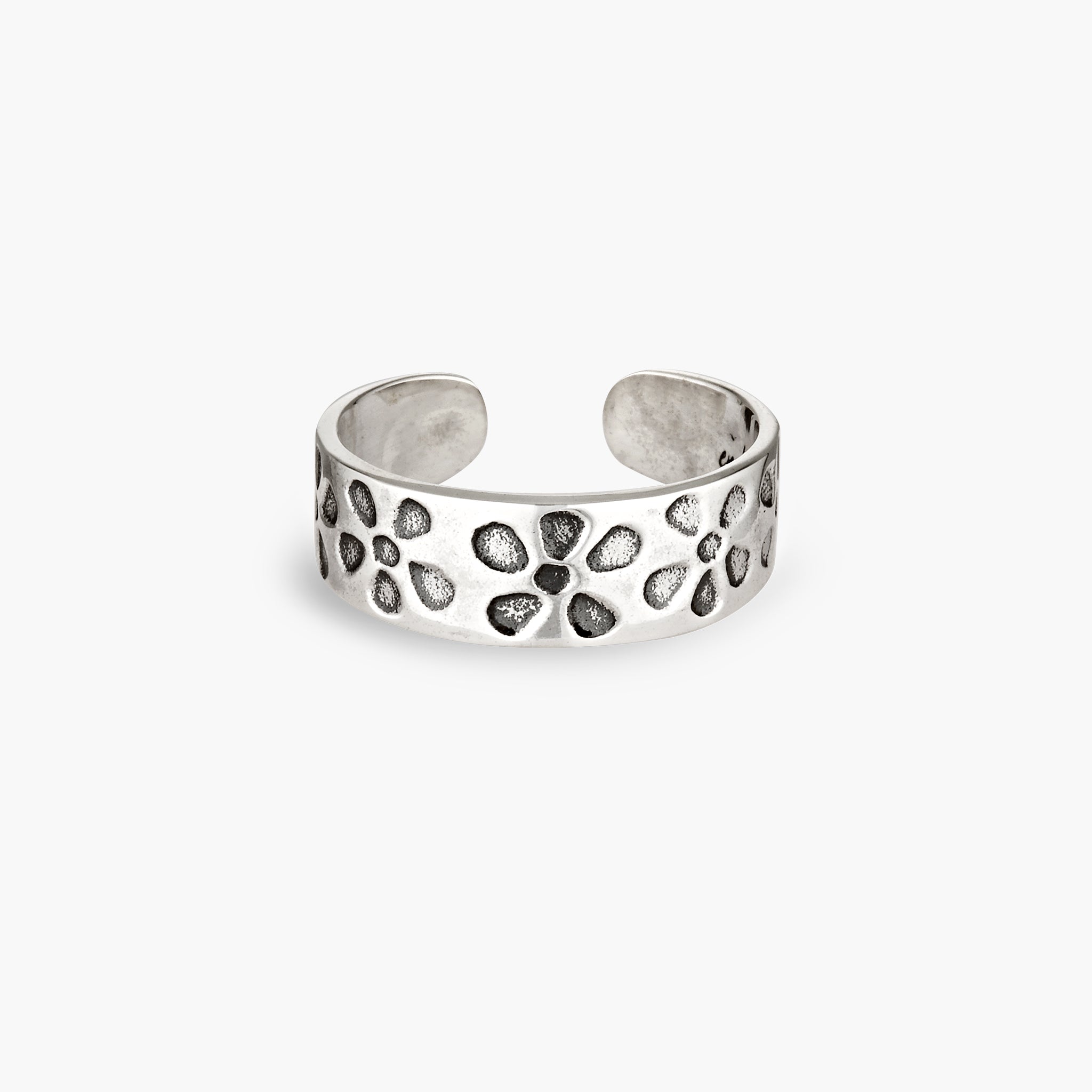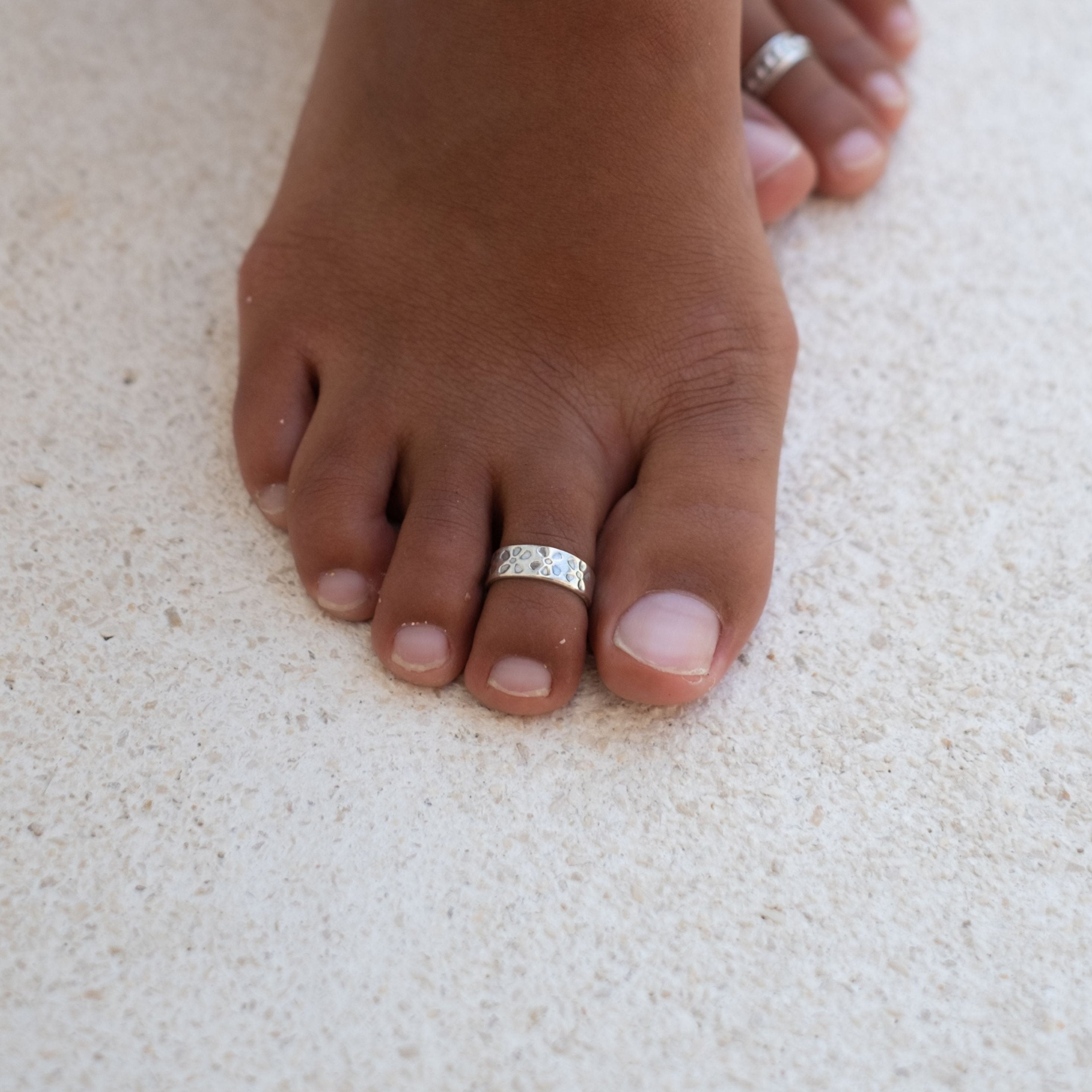 The Daisy Toe Ring is a sterling silver beauty with a thicker band adorned with stamped daisy motifs, adding a touch of floral charm to your step. Completely adjustable for a comfortable fit, this piece combines timeless elegance with a playful design, making it a sweet everyday accessory that celebrates nature's simplicity.