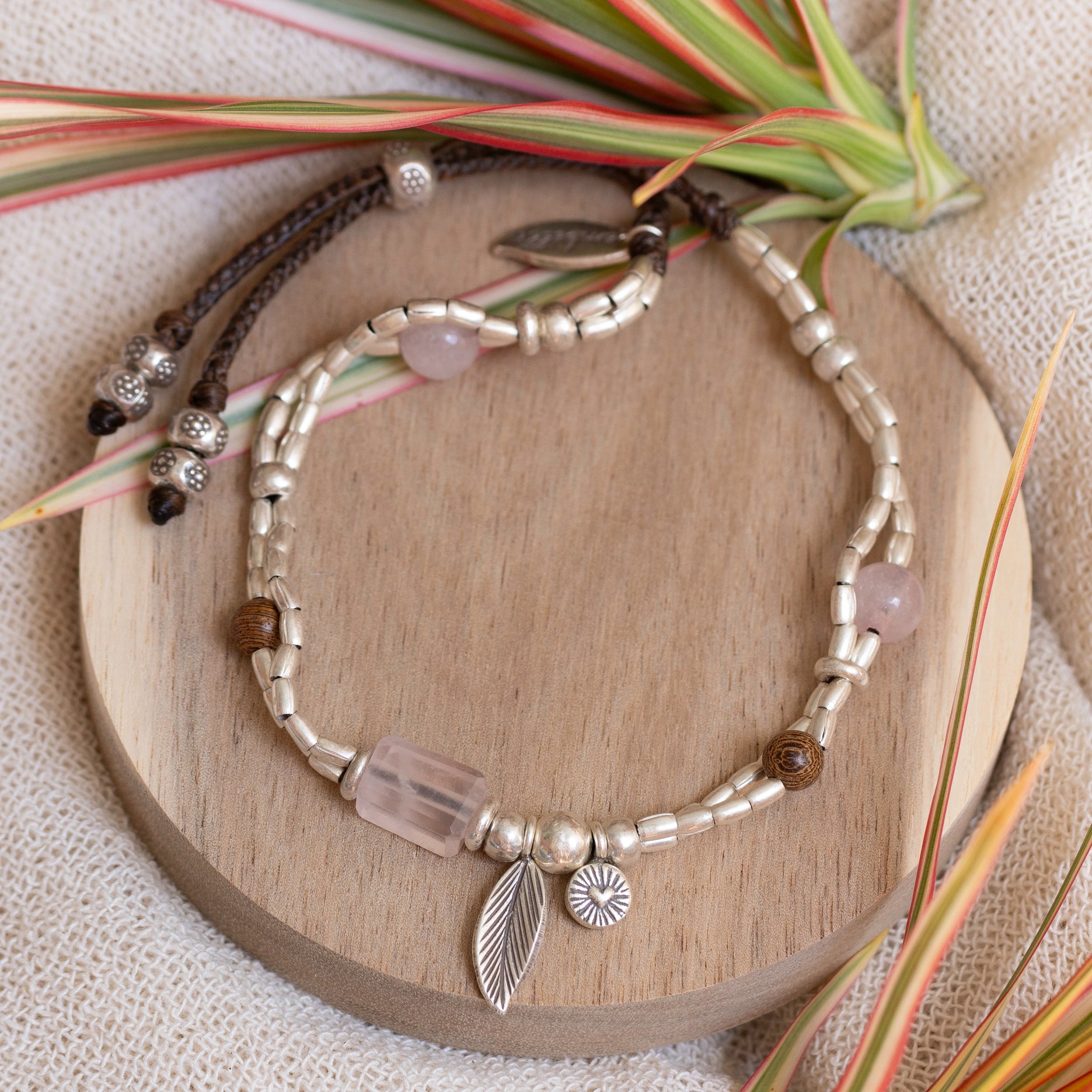 A symbol of love and connection, the Heart Strings Anklet is designed to be as meaningful as it is beautiful. Handcrafted with Hill Tribe Silver, natural wood beads, and a faceted rose quartz centrepiece—known as the stone of unconditional love, promoting self-love and emotional healing. Strung on durable poly wax cotton thread, this anklet is adjustable with a bead slider, allowing for the perfect fit. Simply tie the ends to secure it in place. A timeless piece from our Valentine’s Day Collection, made to be worn close to your heart.