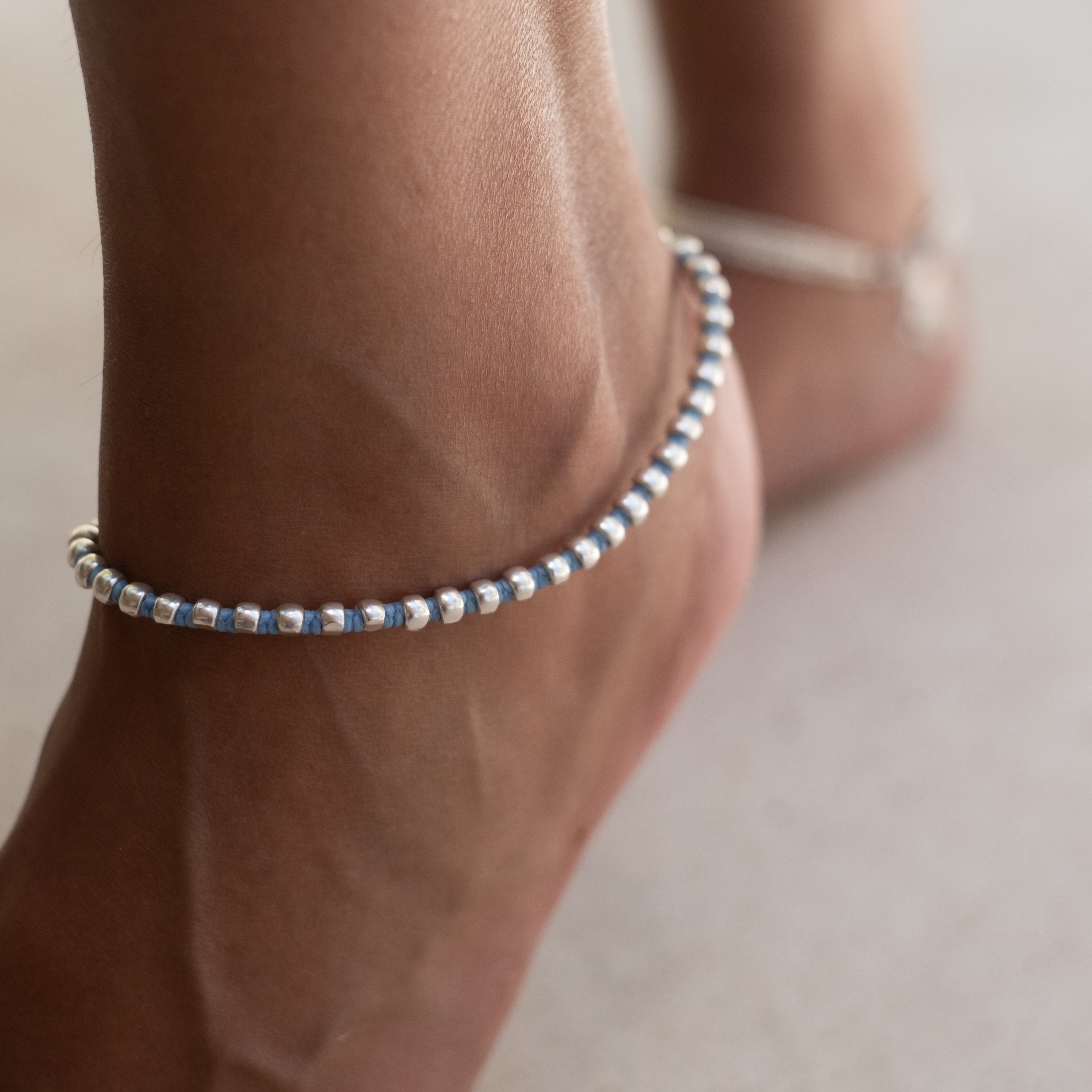 Embella’s boho styled anklets are designed in one of two ways; they either have a sterling silver parrot clasp and chain with approximately 2–3cm of adjustment or a Hilltribe silver bead on polywax cotton cord, which can adjust your anklet more generously. Our silver anklets can be worn in fresh or salt water, just remember to rinse them with fresh water then dry with a soft, cotton cloth afterwards. Store bohemian anklets in a jewellery bag or box.