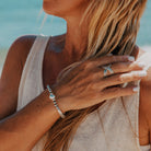 A Soul Sister is the greatest bond between two women – your closest confidant, the person you can always laugh with, and your greatest support. Hand crafted and stamped Hilltribe Silver beads set on a Polywax Cotton cord. An easy fit. Slide the adjustable bead to your comfort, tie a knot to keep in place. Soul Sister Bracelet without Knots Available.
