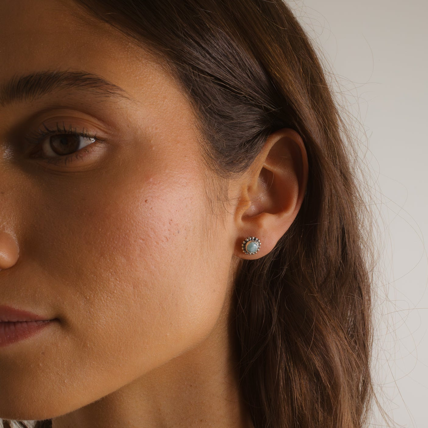Illuminate your style with the captivating beauty of our Dusk Larimar Studs. These exquisite studs feature tumbled Larimar stones, each set within a sterling silver bubble. The soft, serene blue hues of the Larimar evoke the enchanting colors of the evening sky. Embrace the essence of tranquility and add a touch of elegance to your everyday look with the Dusk Larimar Studs.