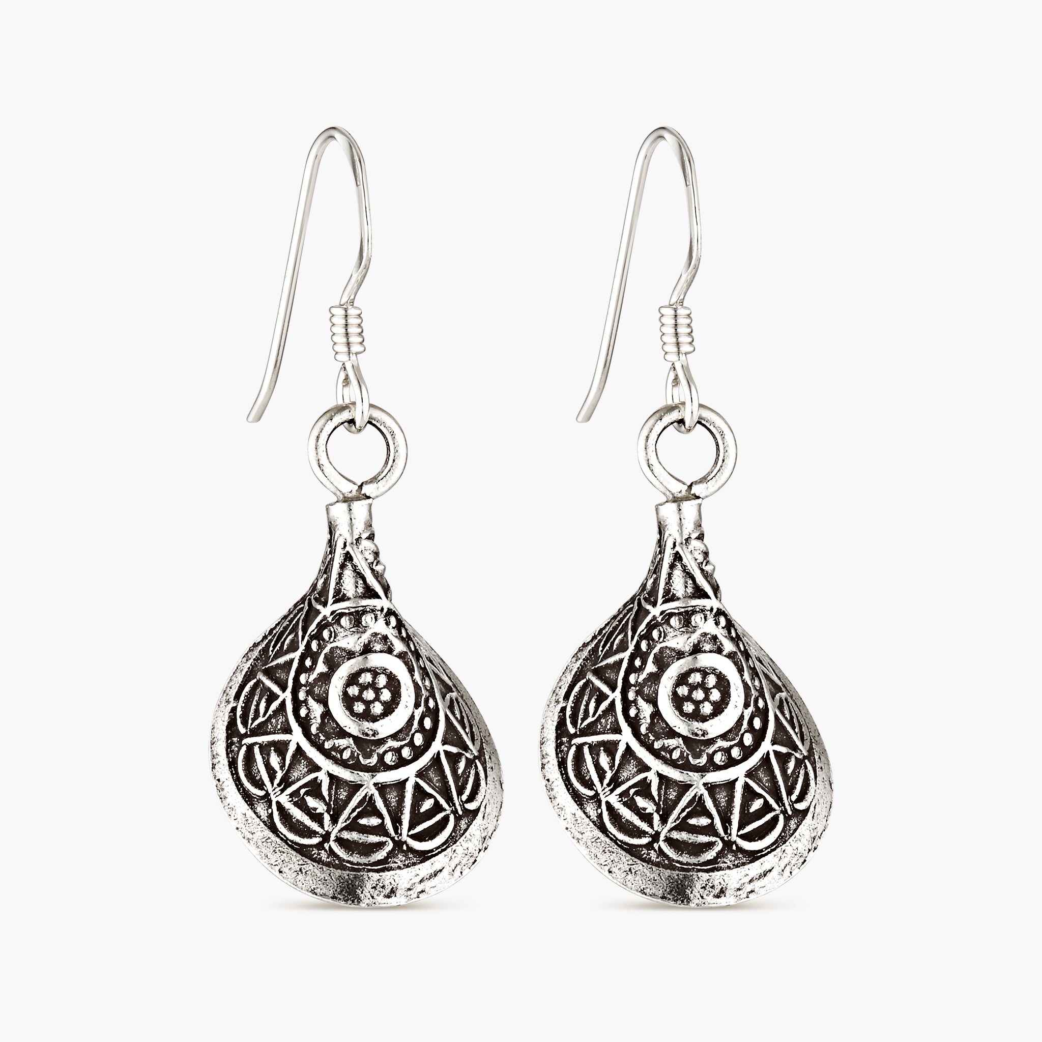 The Gaia Spiral Drops are a unique blend of elegance and cultural inspiration. Crafted from Hill Tribe silver, these bell-shaped drop earrings are a true statement piece, with a beautiful design hand stamped across the front. Suspended from sterling silver ear hooks, they combine timeless design with a touch of exotic charm. The bell shape symbolises clarity and harmony, making these earrings not only a beautiful accessory but also a meaningful addition to your jewellery collection.