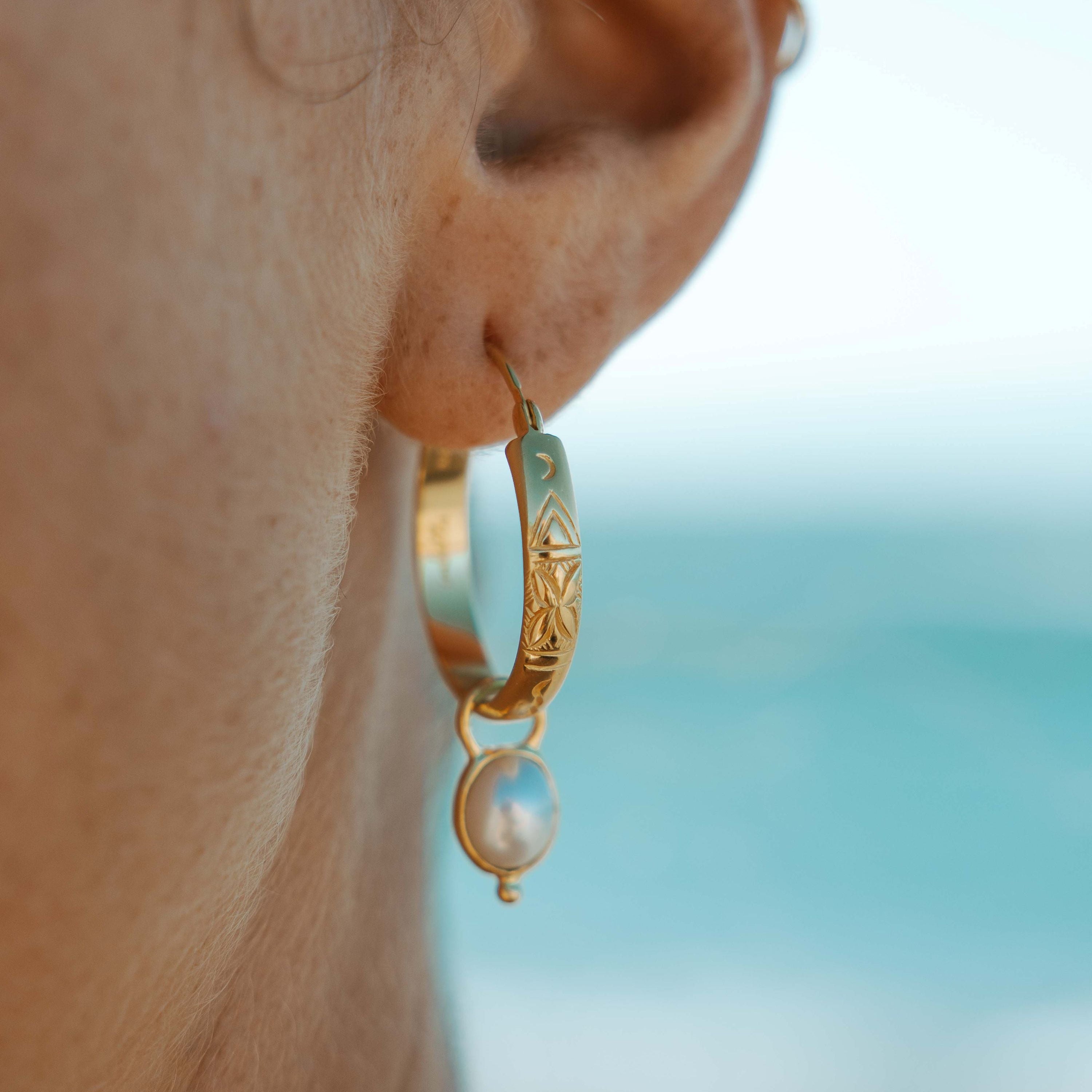 Timeless with an adventurous twist, the Pearl Paradise Hoops are designed to move with you—effortlessly. Crafted from gold-plated sterling silver, each hoop features delicate hand-stamped detailing and a removable pearl charm, allowing you to style them your way. Wear them with the pearl for a luminous, ocean-inspired look, or alone for everyday simplicity.