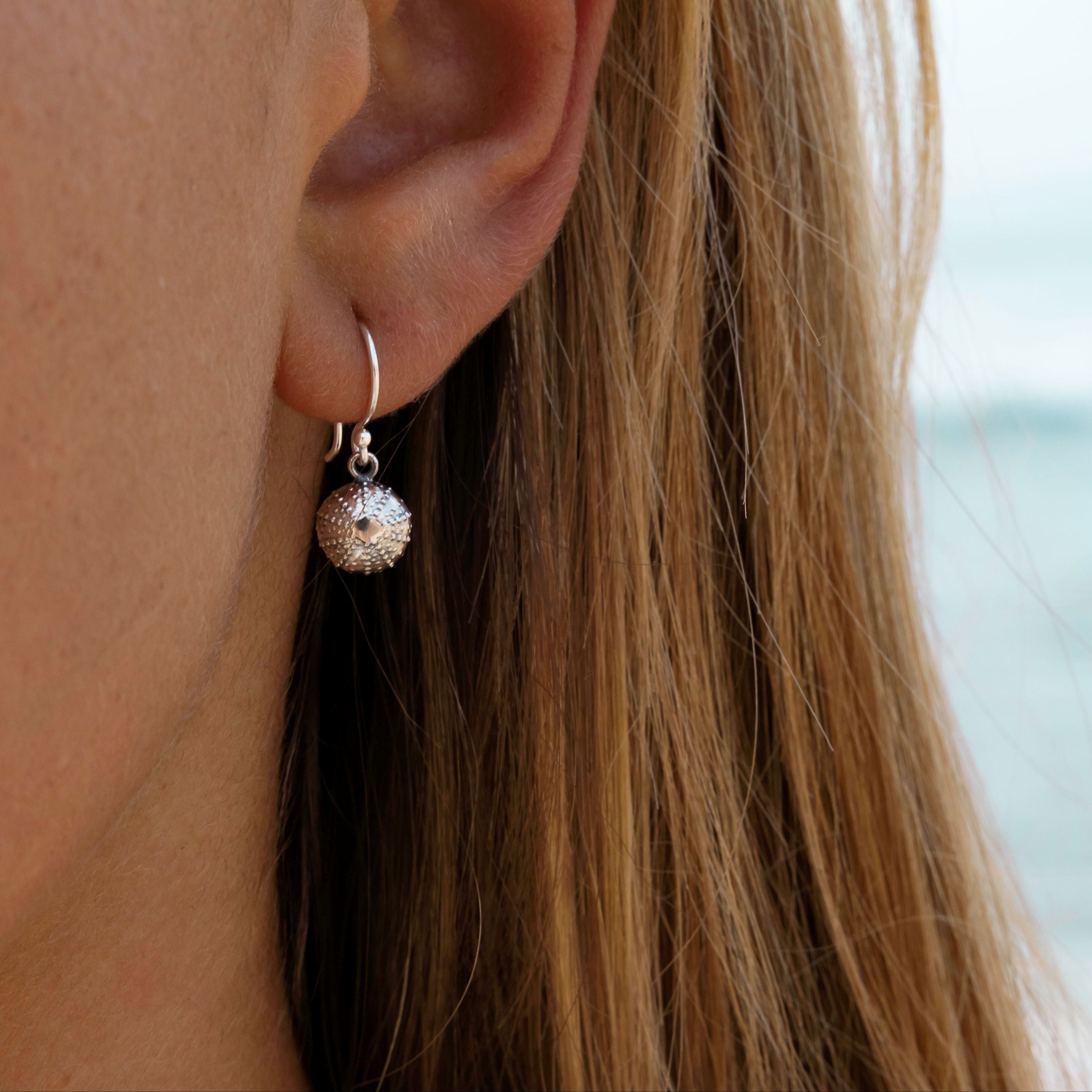 Our Silver Drops Sea Urchin earrings are crafted from sterling silver, inspired by the natural form of sea urchins found along our coastline. In the ocean, sea urchins are essential to the balance of marine ecosystems — quietly tending reefs, cleaning the sea floor and supporting life beneath the waves. Their rounded, shell-like forms symbolise resilience, regeneration and quiet strength. These drops are a gentle reminder that even the smallest creatures play a powerful role — in the oceans and in life.