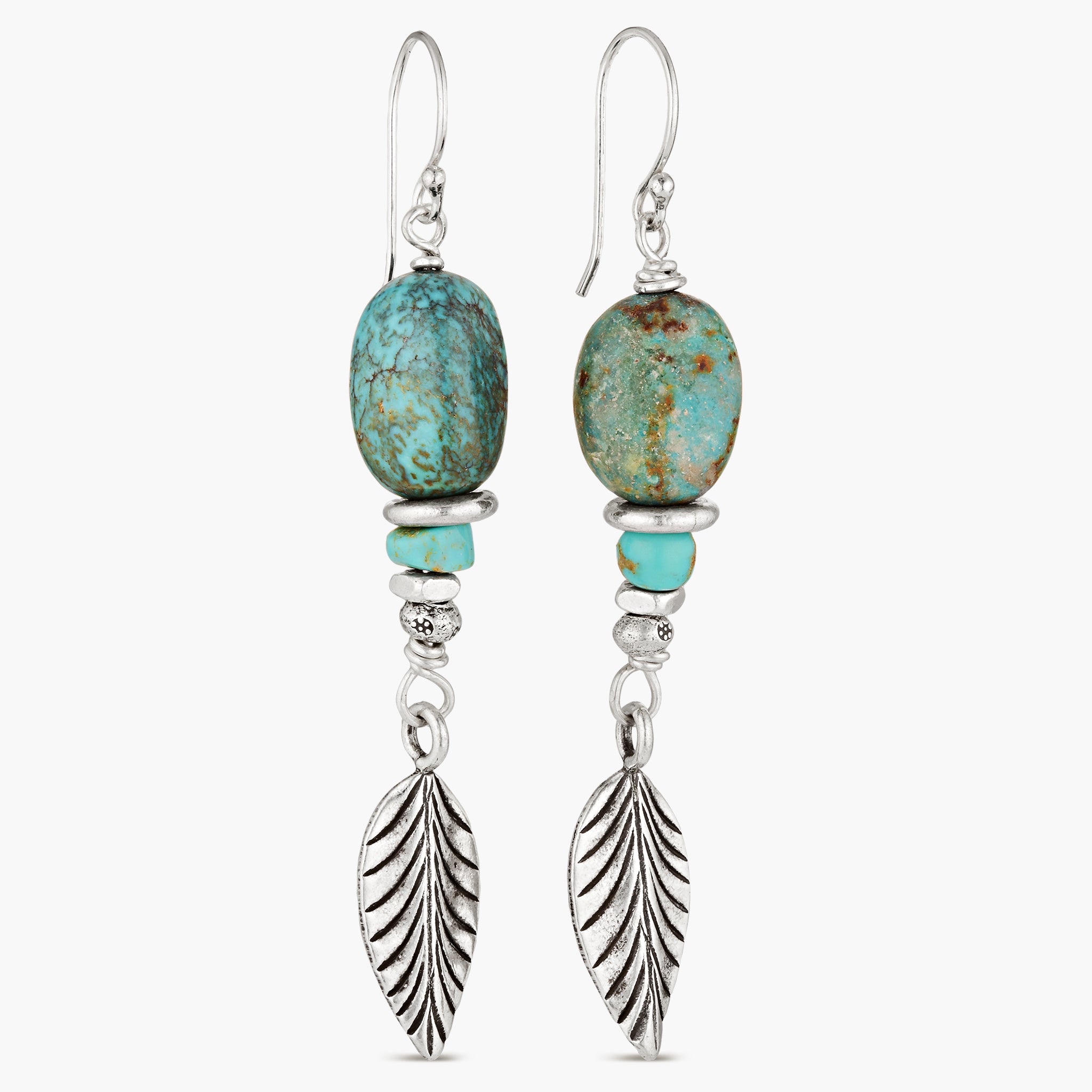 Bring the spirit of the sea to your everyday look with the Turquoise Wanderer Drops. Featuring vibrant turquoise stones paired with handcrafted Hill Tribe silver leaves and beads, all suspended from sterling silver hooks, these earrings are both meaningful and effortlessly versatile. Perfect for layering or wearing solo, they carry the calming and protective energy of turquoise wherever you go.