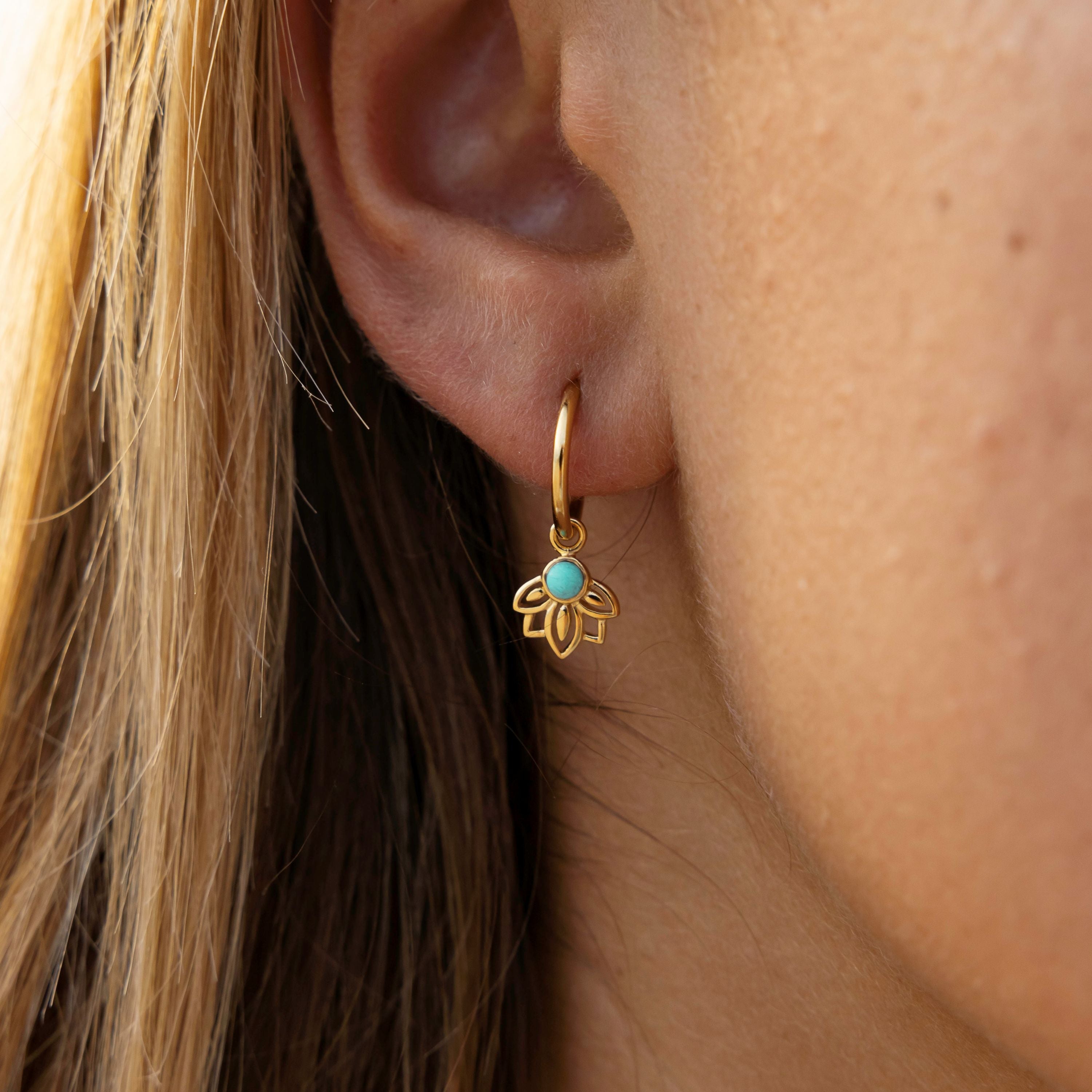 Radiating calm and clarity, the Lotus Huggies feature a delicate lotus flower design, crafted in 18k gold plating with a vibrant turquoise stone at its centre. Symbolising growth, renewal, and inner peace, the lotus pairs perfectly with turquoise — a stone of protection and serenity. A meaningful everyday piece to keep you grounded and glowing.