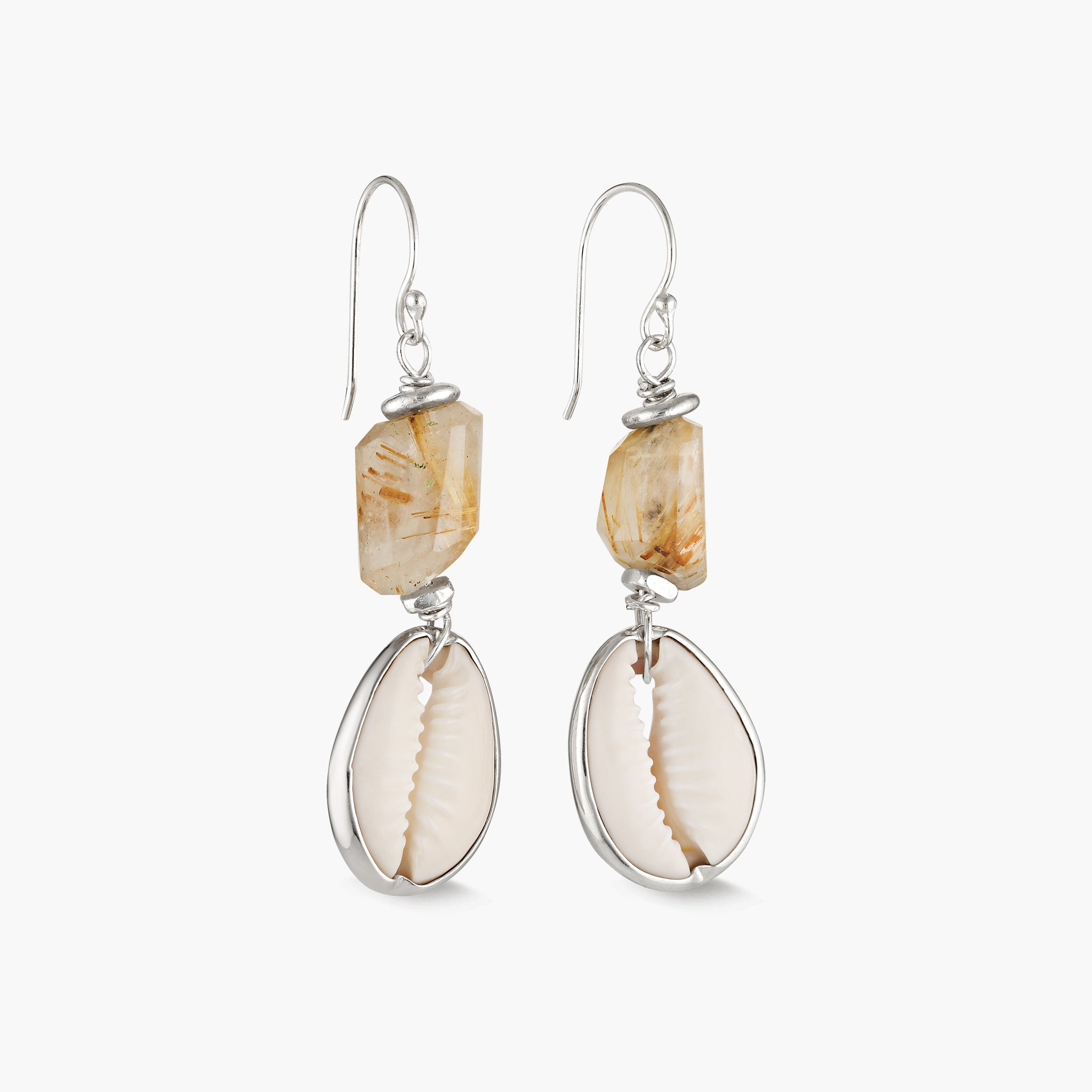 Embrace the ethereal beauty of the night sky with our Ocean Quartz Drops. These earrings feature sterling silver components, including a cowrie shell delicately set in silver. The centre piece of these earrings is the mesmerizing Rutilated Quartz, known for its golden needle-like inclusions that resemble strands of hair, giving it a unique and mystical appearance. Rutilated Quartz is believed to be a powerful healing stone, promoting spiritual growth, clarity, and transformation.