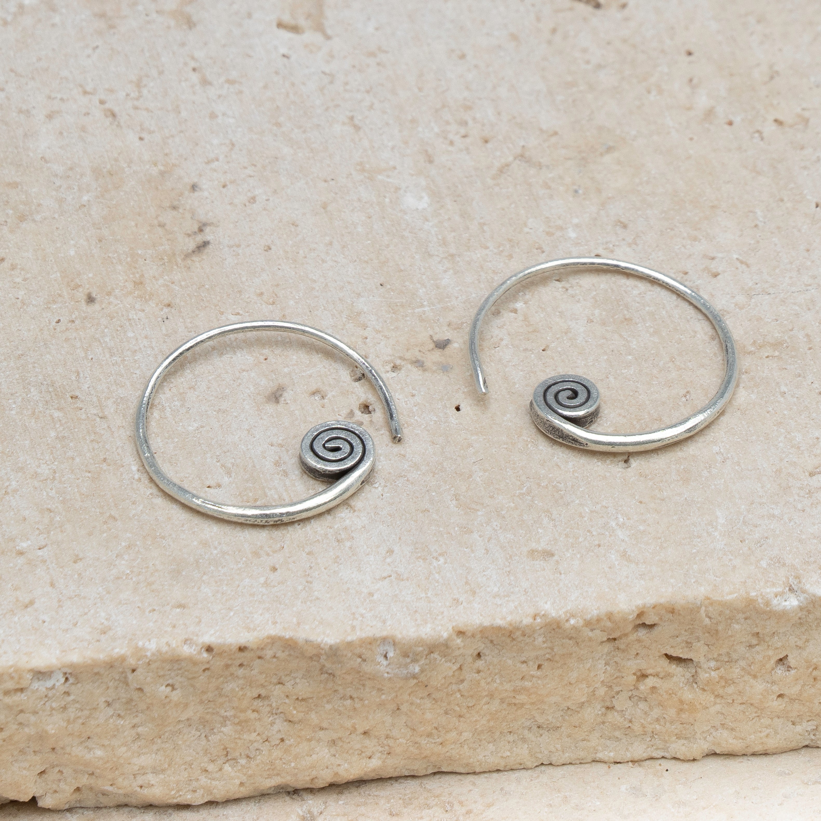 Our Silver Spiral Hoops are crafted from Hill Tribe silver and elegantly pull through the ear, creating a minimalist yet striking look. The spiral, an ancient symbol of growth, transformation, and the journey of life, adds a deeper meaning to these hoops. Perfect for those who appreciate both style and symbolism, these hoops embody the continuous flow of energy and the path to inner peace.