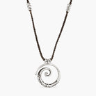 Our Temple of the Spirit Spiral features a unique tribal print throughout the stamping design. Hand crafted Hilltribe Silver delicately curved into an elegant spiral shape weaved onto a Polywax Cotton cord design.