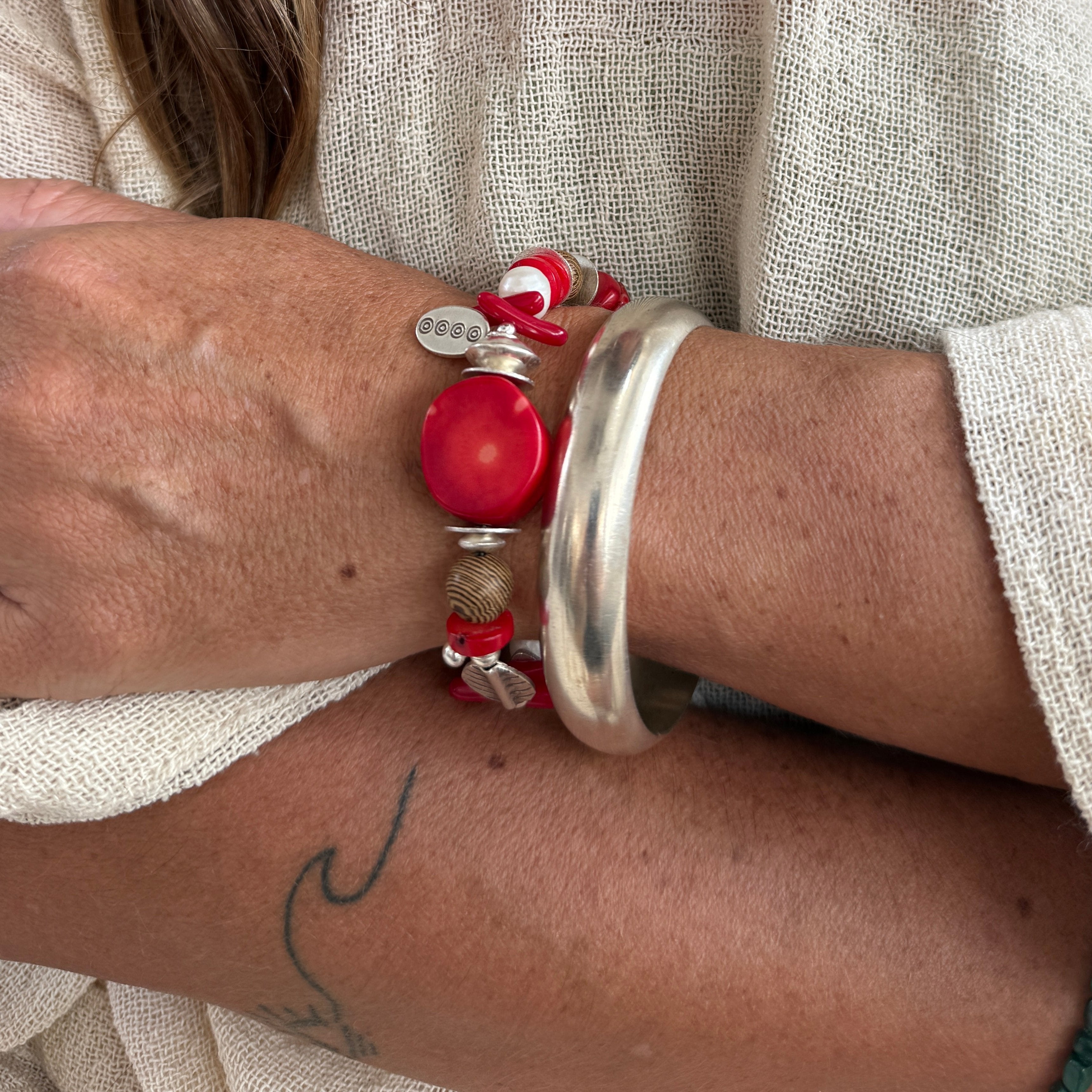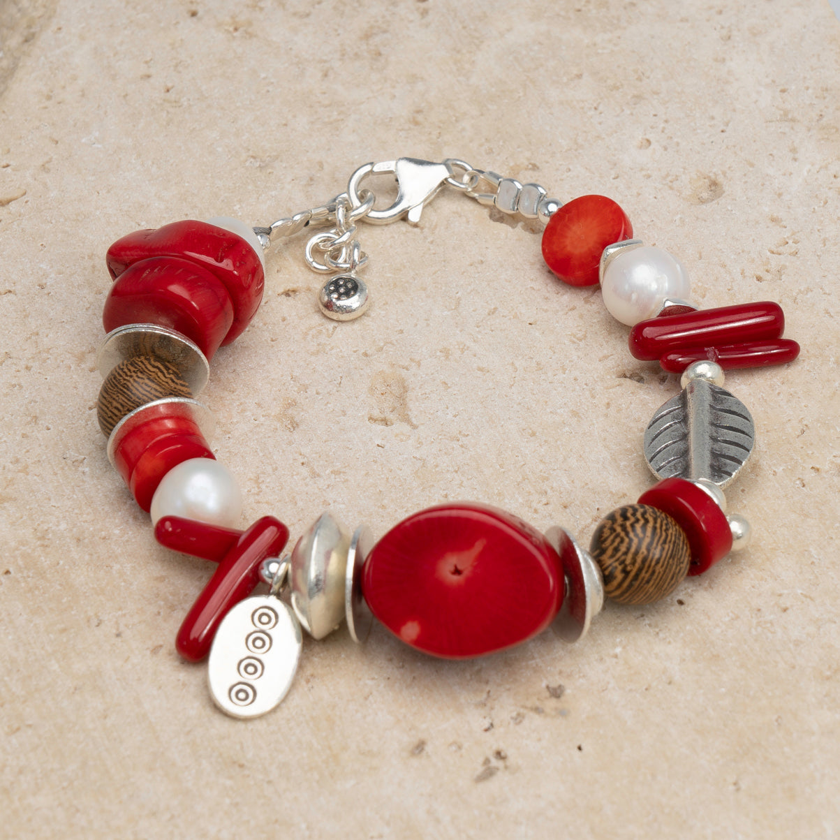 Add a festive touch to your wrist with the Coral Noel Bracelet, a statement piece from our limited-edition Christmas Collection. Featuring vibrant red coral, sea bamboo beads, lustrous pearls, tumbled wood accents, and Hill Tribe silver spacers, this bracelet is a true celebration of the holiday season. Finished with a sterling silver parrot clasp, the Coral Noel Bracelet is perfect for elevating your holiday ensembles. Pair it with the matching Coral Noel Necklace and Drops for a coordinated, festive look or wear it solo as a standout accessory. Please note, this bracelet is not designed for water wear.
