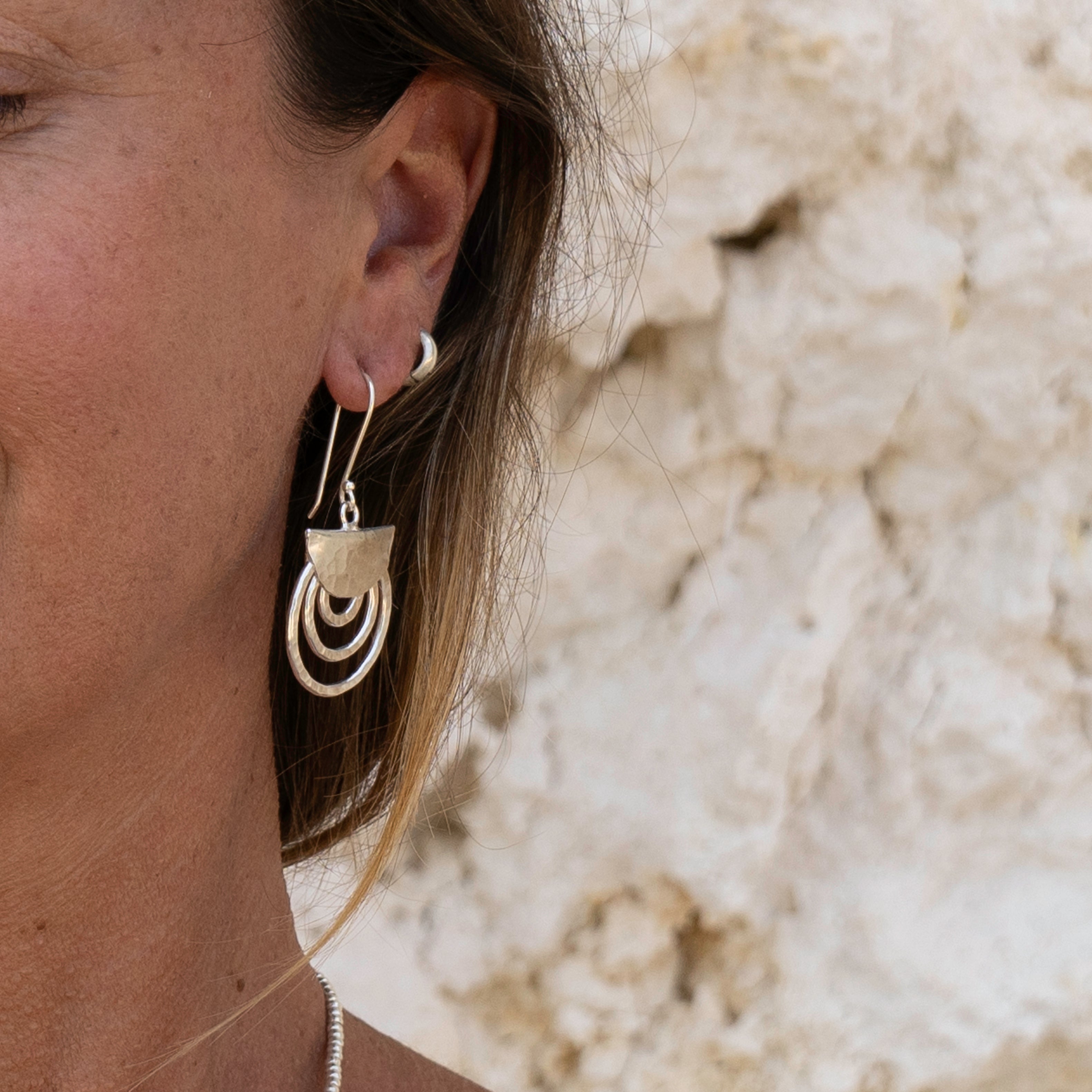 Introducing the Silver Eclipse Drops, reminiscent of the celestial beauty of an eclipse. These earrings are crafted from Hill Tribe silver, hand hammered to perfection and paired with sterling silver ear hooks. They add a touch of ethereal elegance and artisanal craftsmanship to any ensemble, making them a captivating accessory for any occasion.