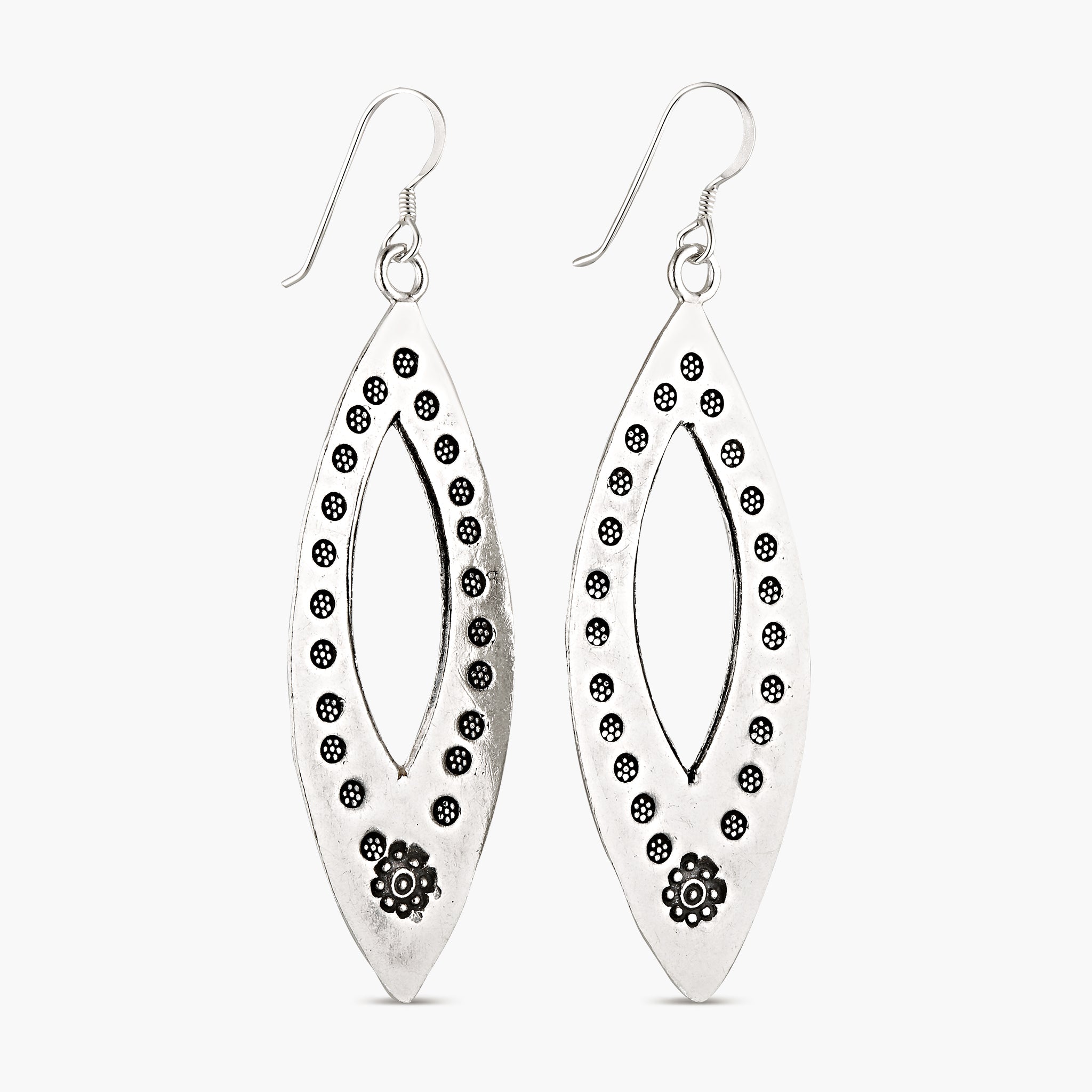 The Silver Isla Drops feature an elegant eye-shaped pendant with a cutout centre, beautifully handcrafted from Hill Tribe silver. Delicate floral details are hand-pressed onto the surface, adding a touch of nature-inspired charm to this unique design. Suspended from sterling silver ear hooks, these lightweight earrings offer a perfect blend of artisan craftsmanship and refined beauty, ideal for everyday wear or special occasions.