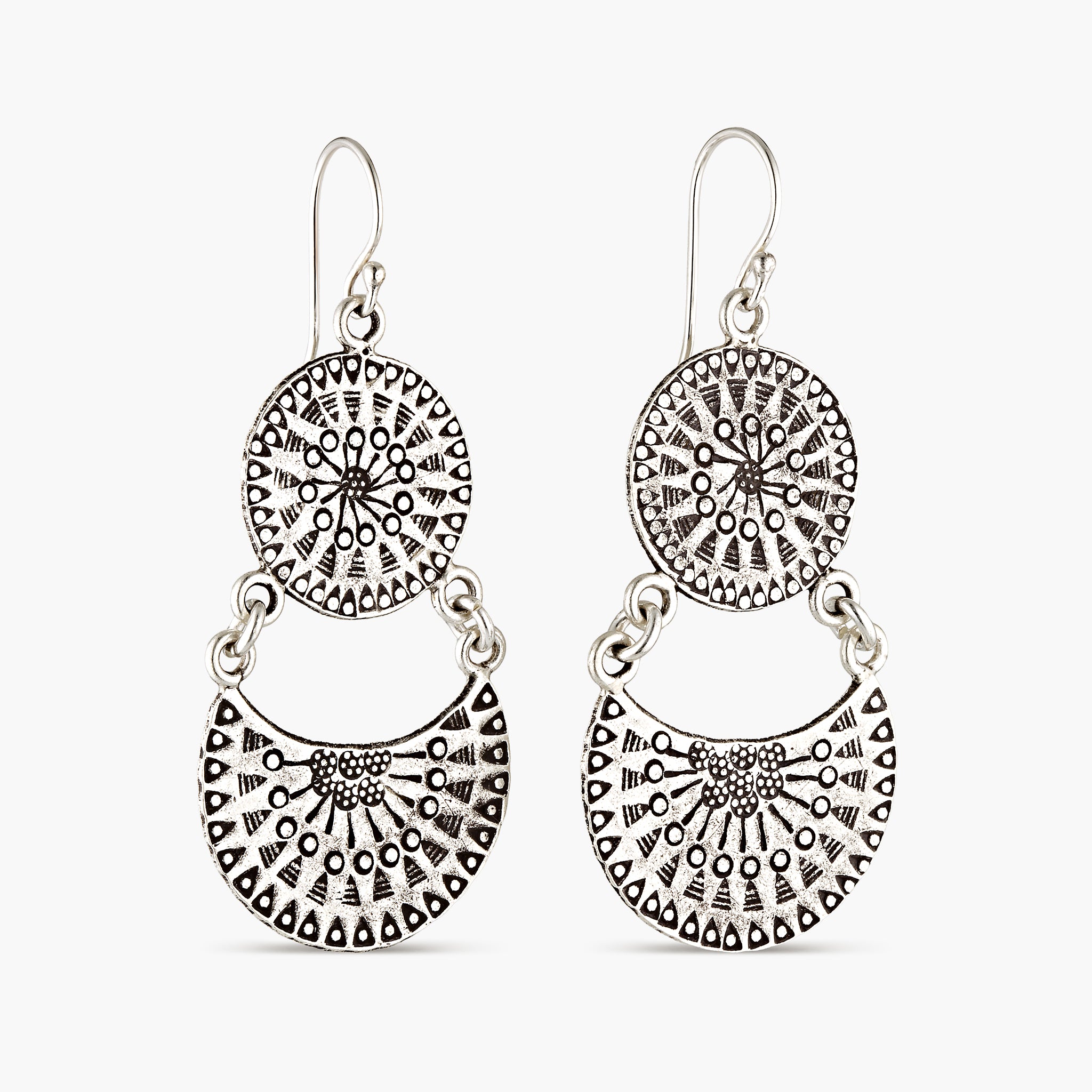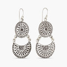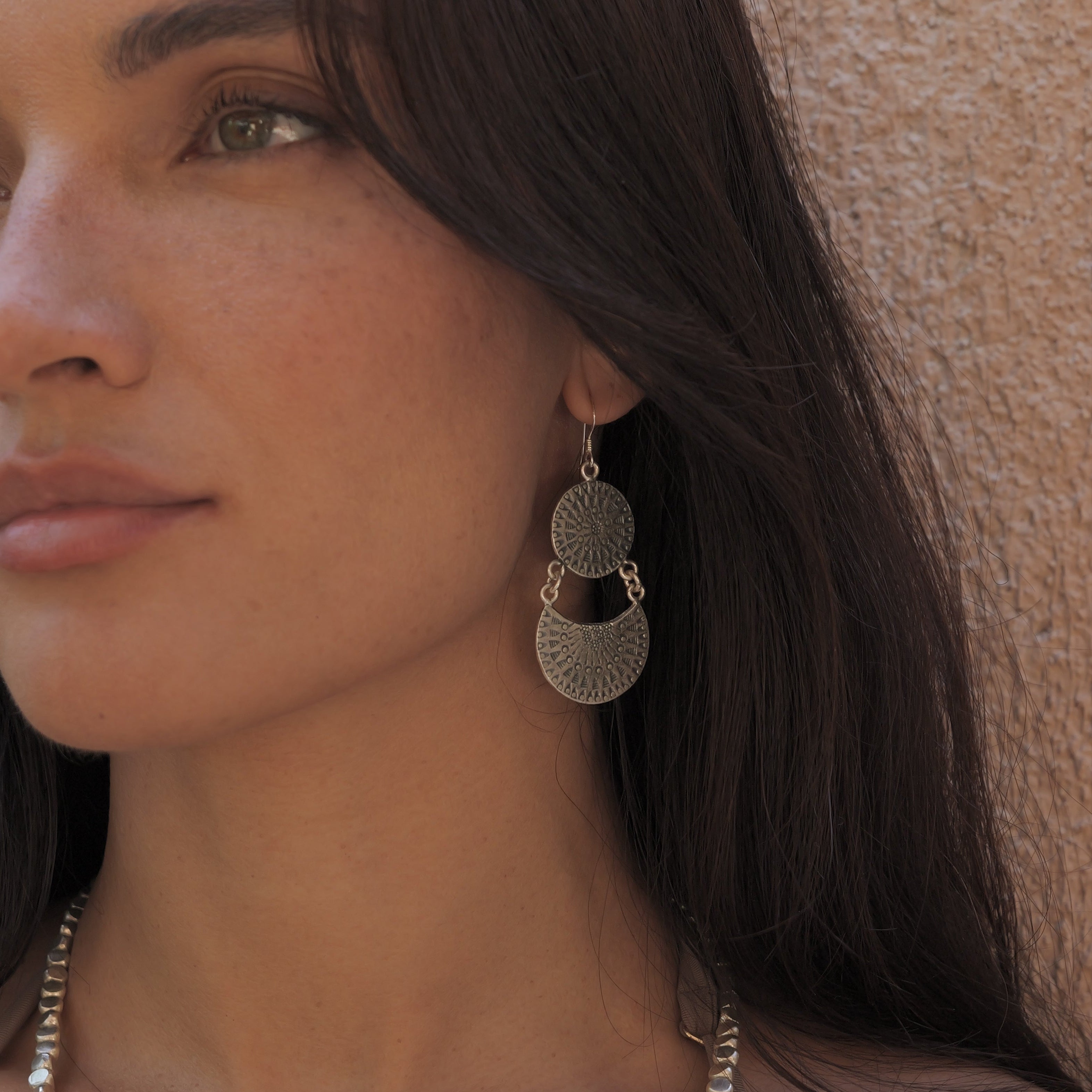 Embrace your inner free spirit with our Sun Goddess Drops. These enchanting earrings, crafted from hilltribe silver and finished with sterling silver ear hooks, feature hand-stamped sun and crescent moon charms that capture a boho vibe. Each charm is meticulously detailed, reflecting the artisanal craftsmanship of hilltribe silversmiths. Perfect for those who love to blend elegance with a touch of bohemian flair, the Sun Goddess Drops are a radiant addition to any jewellery collection.