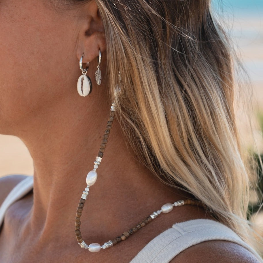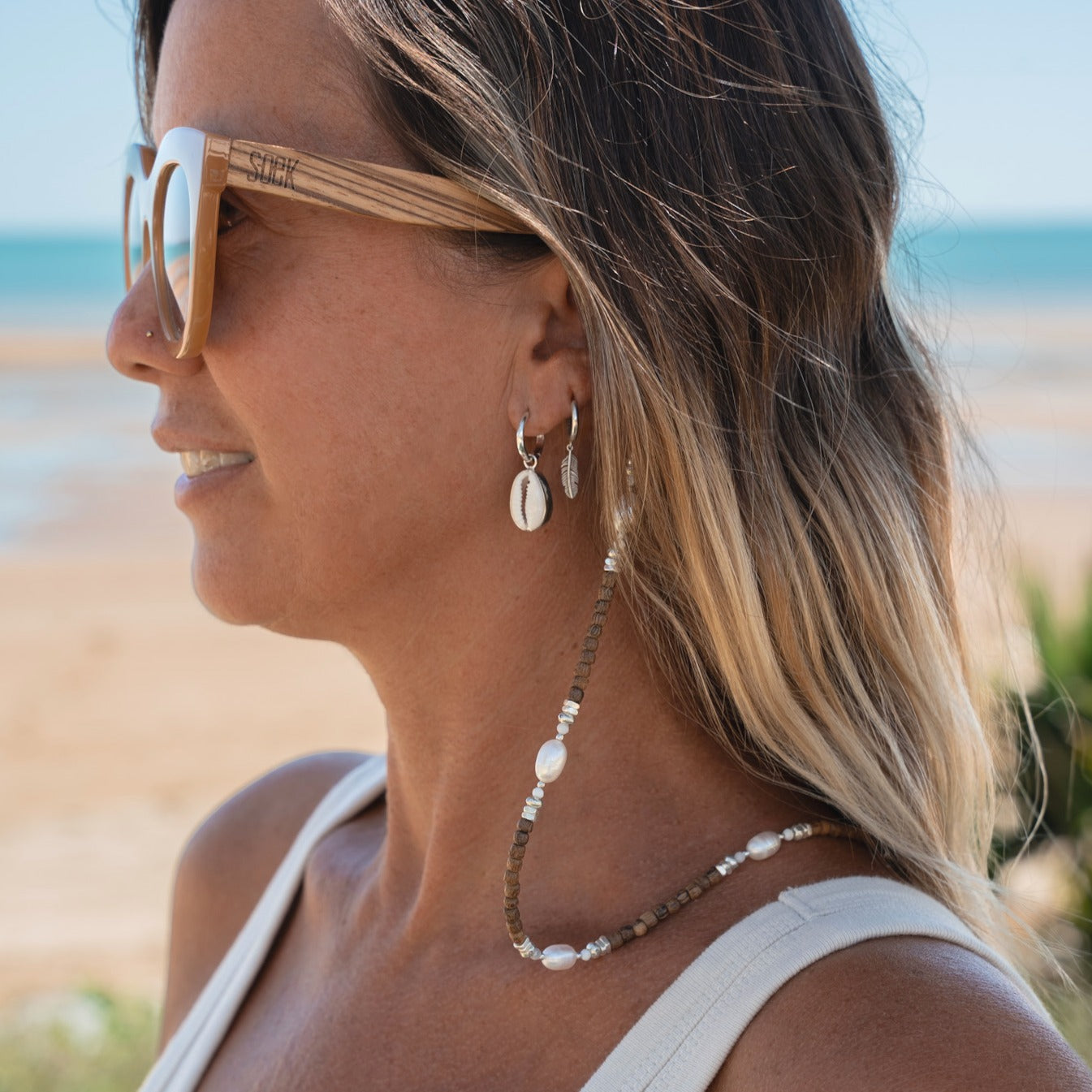 Introducing our exquisitely crafted Pearlwood Sunglass Slinger, where each element is individually handmade with meticulous attention to detail. This stunning eyewear strap showcases lustrous freshwater oval pearls, earthy wooden beads, and calming faceted howlite stone balls, all thoughtfully threaded alongside Hilltribe silver charms and sterling silver balls. Secured with black rubber sunglass holders, this accessory effortlessly combines natural elements with boho elegance, providing a secure and stylish way to keep your sunglasses close. Embrace the coastal charm and elevate your sunnies with this unique and beautifully handmade creation.