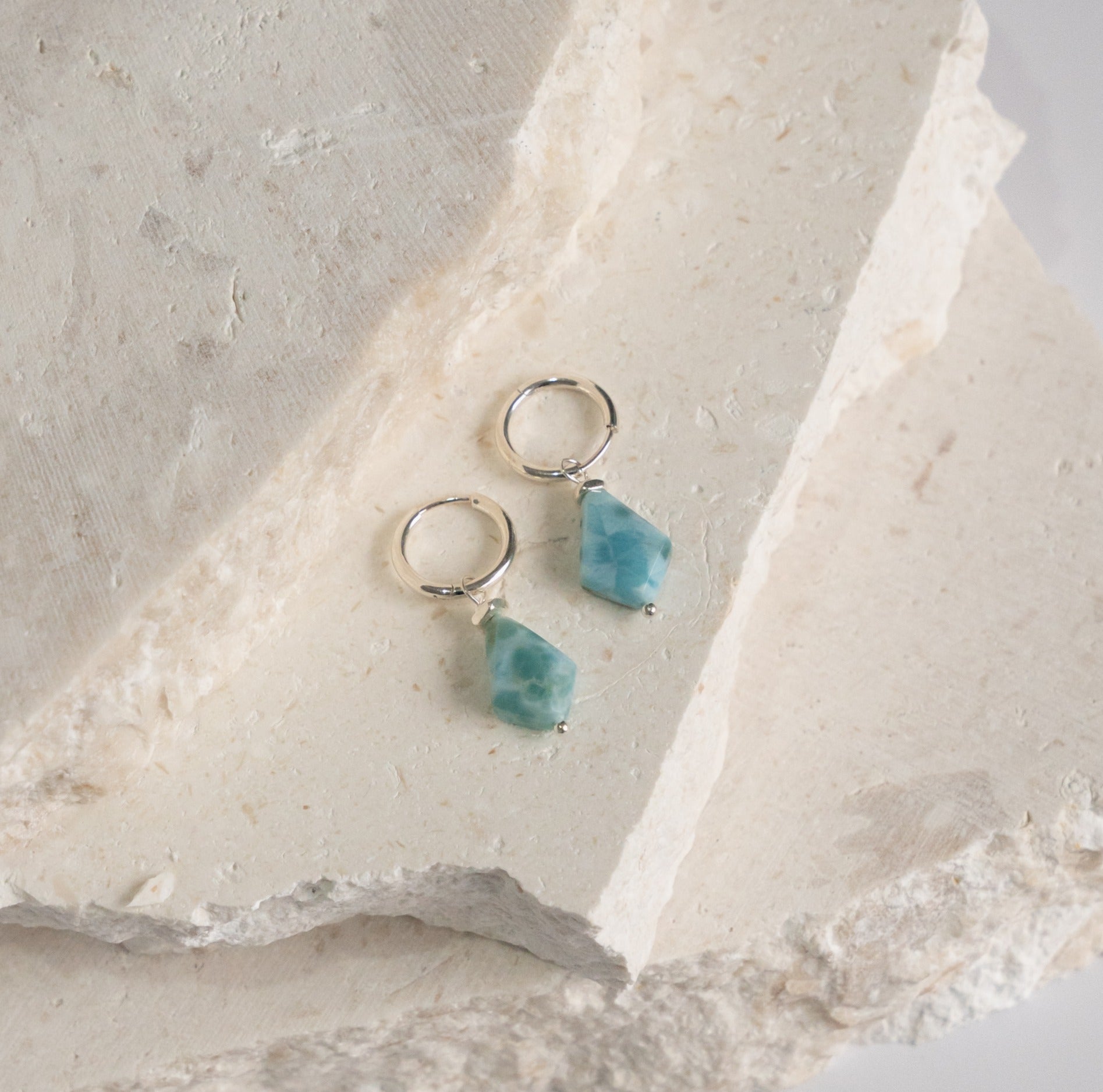 The Larimar Diamond Huggies are a stunning blend of elegance and natural beauty. Each earring features a hand-cut, diamond-shaped Larimar stone with a Hilltribe silver setting and a sterling silver huggie. The Larimar stone is believed to promote tranquillity, reduce stress, and bring a sense of calmness to the wearer.
