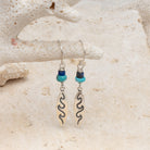 Ride the waves in style with our Wave Rider Drops. Featuring a sterling silver surfboard charm and ear hooks, these earrings are adorned with a lapis lazuli bead and a turquoise bead. Lapis lazuli is known for promoting wisdom, truth, and inner peace, while turquoise is celebrated for its protective properties and ability to bring good fortune and serenity. Together, these stones create a harmonious blend of positive energy and natural beauty.