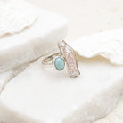 Embrace the ethereal beauty of the Aurora Ring, crafted with care from Tumbled Larimar, a stone of tranquility and harmony, and adorned with a lustrous Freshwater Pearl. Encased in Sterling Silver, this ring captures the enchanting allure of the aurora borealis, reflecting its celestial charm and mesmerizing hues. Wear the Aurora Ring as a symbol of inner peace and natural wonder, carrying the essence of the heavens in your grasp. Let its radiant elegance adorn your fingers, elevating your style with a touch of celestial magic.