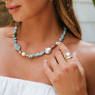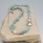 Immerse yourself in the serene beauty of the ocean and sky with the Larimar Sky Reflections Necklace. Featuring large-cut Larimar chips, this necklace captures the soothing hues of tranquil waters and endless horizons. Larimar, known as the "Stone of Tranquillity," is believed to inspire relaxation, calm the mind and promote emotional healing. Delicately accented with luminous freshwater pearls and intricately detailed Hill Tribe silver spacers, this piece exudes a natural elegance.