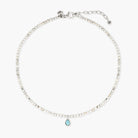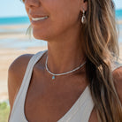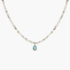 Experience the calming essence of our Larimar Harmony Choker with Howlite. Handcrafted with a Larimar teardrop pendant set-in sterling silver, this exquisite piece is adorned with faceted howlite stones, Hilltribe Silver beads, and Sterling Silver beads. Embrace the tranquil energy of Larimar and the soothing properties of howlite as you wear this captivating choker. Length: 37.5cm choker, overall, 42.5cm with chain. Elevate your style and connect with the serenity of the sea.