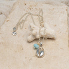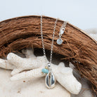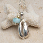 The Larimar Oceana Necklace is a stunning blend of oceanic beauty and elegant design. This piece features a tumbled Larimar charm, known for its calming and healing properties, set on a sterling silver chain. Accented with a plated gold bead and a sterling silver cowrie charm, the necklace captures the essence of the sea. Whether worn alone or layered, the Larimar Oceana Necklace is a perfect reminder of the ocean's serene beauty and strength, making it an ideal accessory for any occasion.