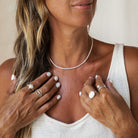 Adorn your neckline with the timeless elegance of our Freshwater Pearl Choker. Delicate and refined, this choker features freshwater pearls meticulously hand-threaded onto a durable Tigertail wire. The pearls boast a mesmerizing pearlescent hues in enchanting champagne.