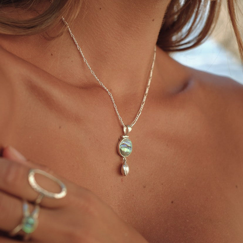 Shimmering with ocean light, the Paua Purity Necklace is handcrafted in sterling silver with an iridescent paua pendant and a luminous pearl drop suspended beneath. A symbol of harmony and purity, this piece captures the beauty of the sea in every detail. Designed to pair perfectly with the matching Paua Purity Drops.