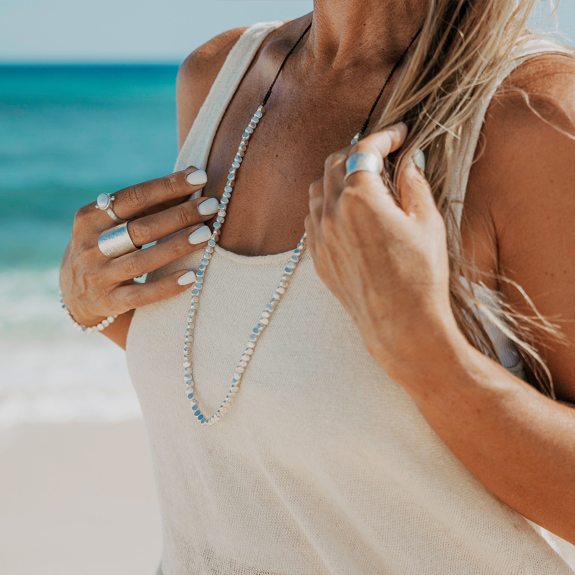 Unveil your inner radiance with our Reflections Necklace. Handcrafted with precision, this necklace features exquisite Hill Tribe silver triangle solid beads that reflect the light with every movement. The adjustable polywax cotton ensures a perfect fit, while the securing charms add a touch of elegance. Let the Reflections Necklace be a symbol of your unique journey, reflecting your true essence with grace and style.