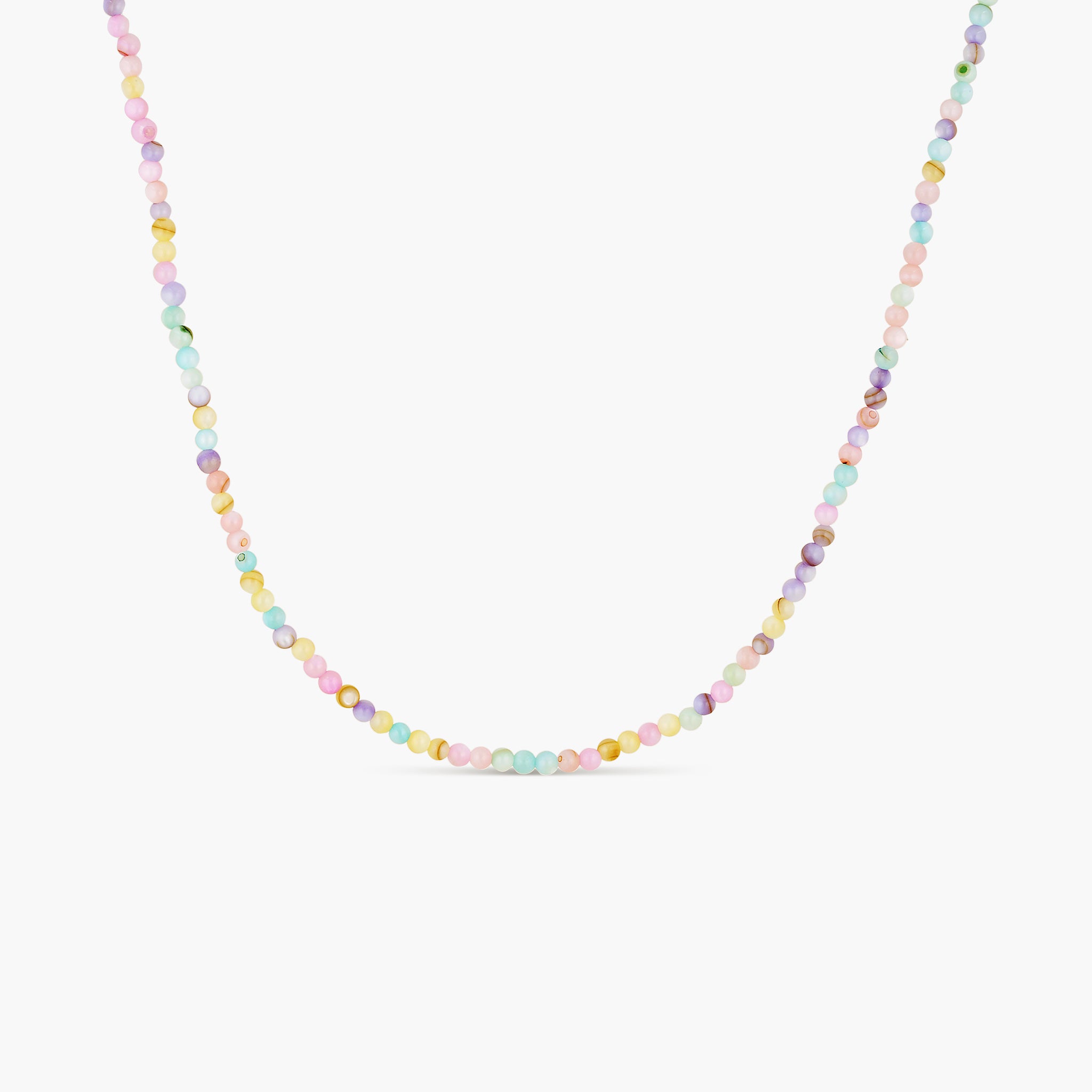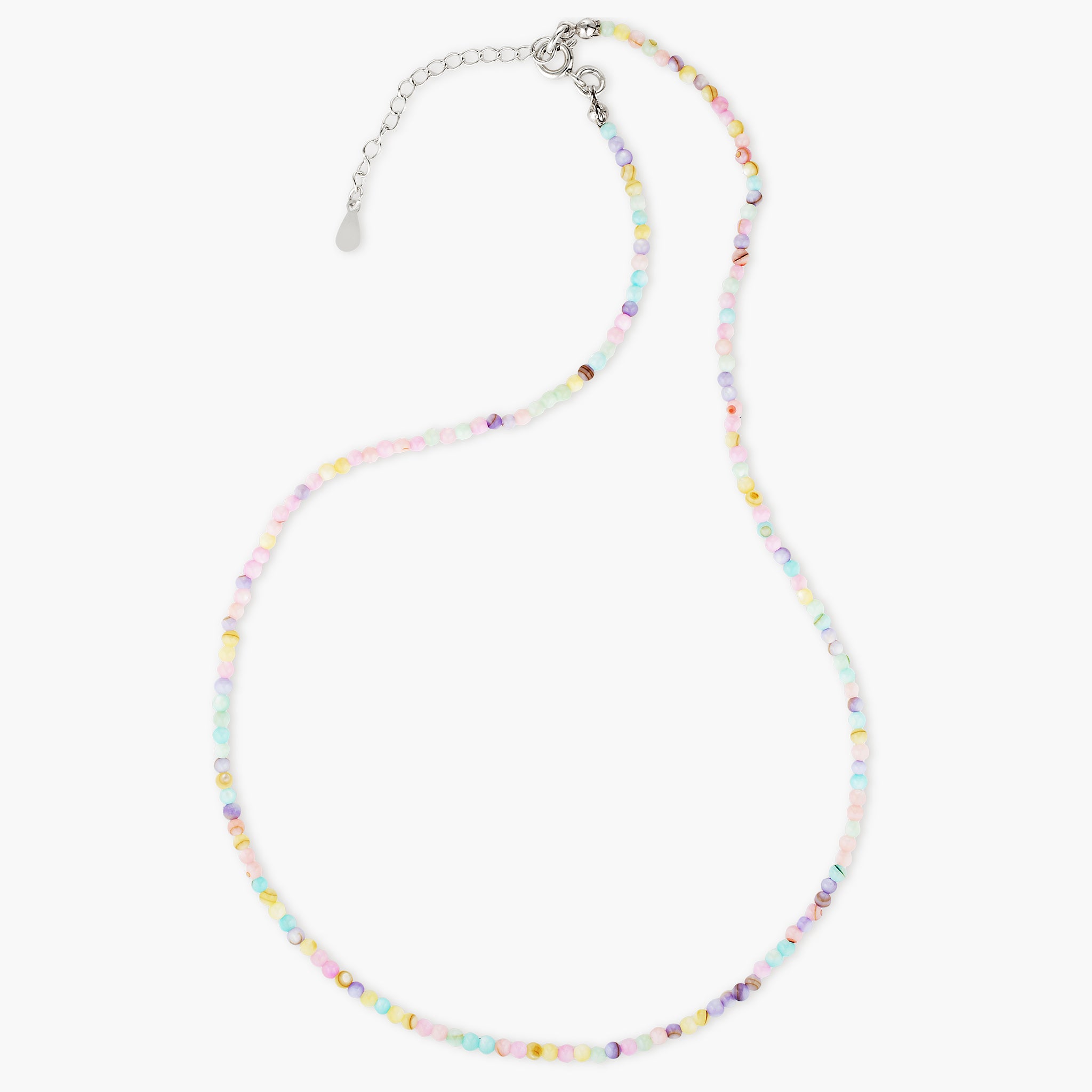 Capture the colours of the ocean with the Shell Sunrise Choker, featuring vibrant shell beads threaded on waterproof jewellery thread and finished with a sterling silver clasp and adjuster.