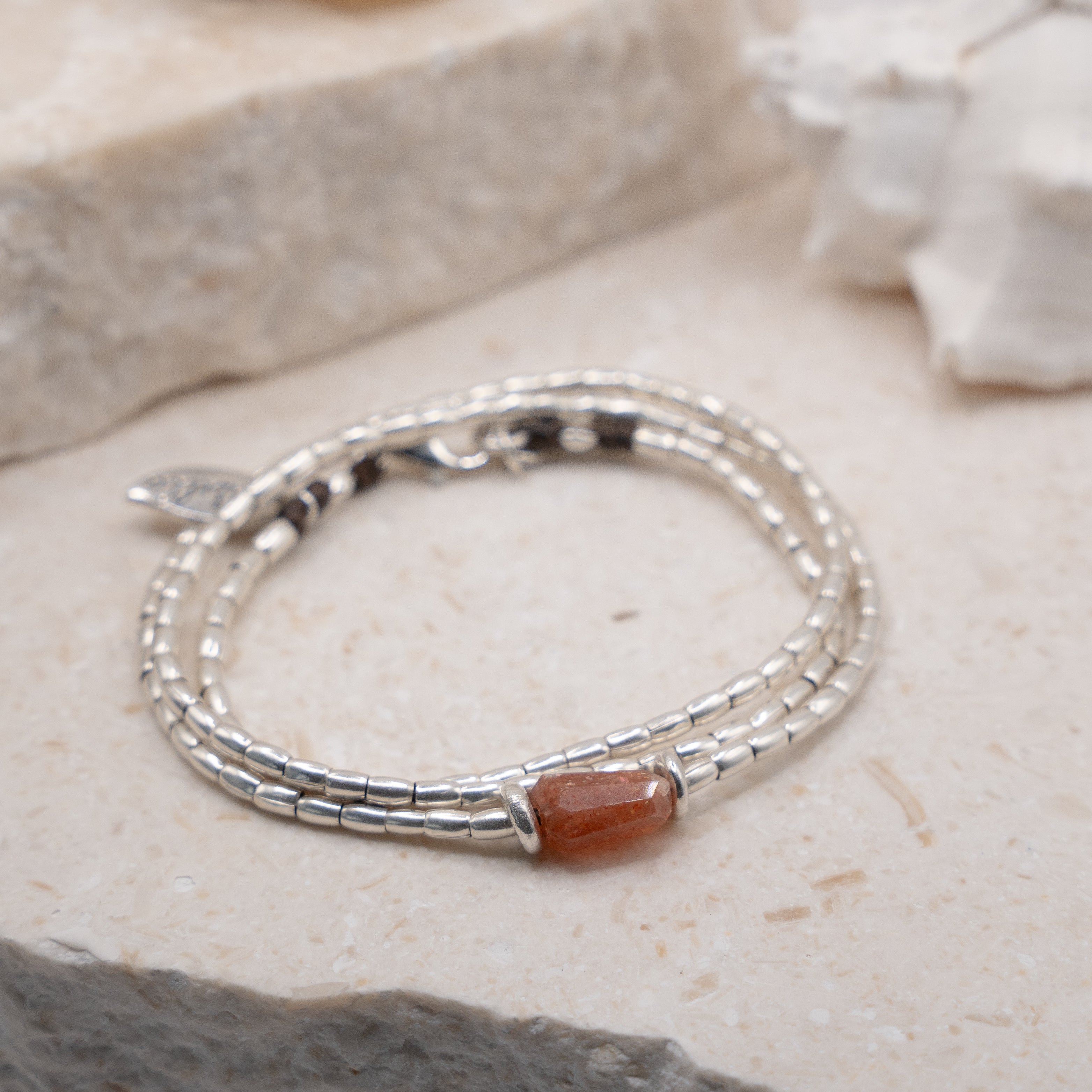 Introducing our Sunstone Sol Wrap—an embodiment of versatility and elegance. Crafted with faceted sunstone, hilltribe silver beads and a sterling silver parrot clasp. Sunstone is known to bring vitality and energy toits wearer, a stone that promotes positivity and optimism. Wear it as a bracelet, necklace or anklet—this versatile design effortlessly adapts to your style and mood.