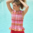 Discover effortless elegance with this shirred sleeveless top, pictured in a vibrant plaid pattern in warm shades of pink and orange. Crafted from a lightweight, breathable cotton poplin, it offers comfort and a touch of sophistication perfect for sunny days or casual outings. The top features cowrie shell buttons down the side, adding a unique and coastal-inspired detail. The ruffled hem adds a playful, feminine flair, making it a versatile piece that pairs beautifully with skirts or jeans. Elevate your wardrobe with this charming top that embodies chic comfort and timeless style.