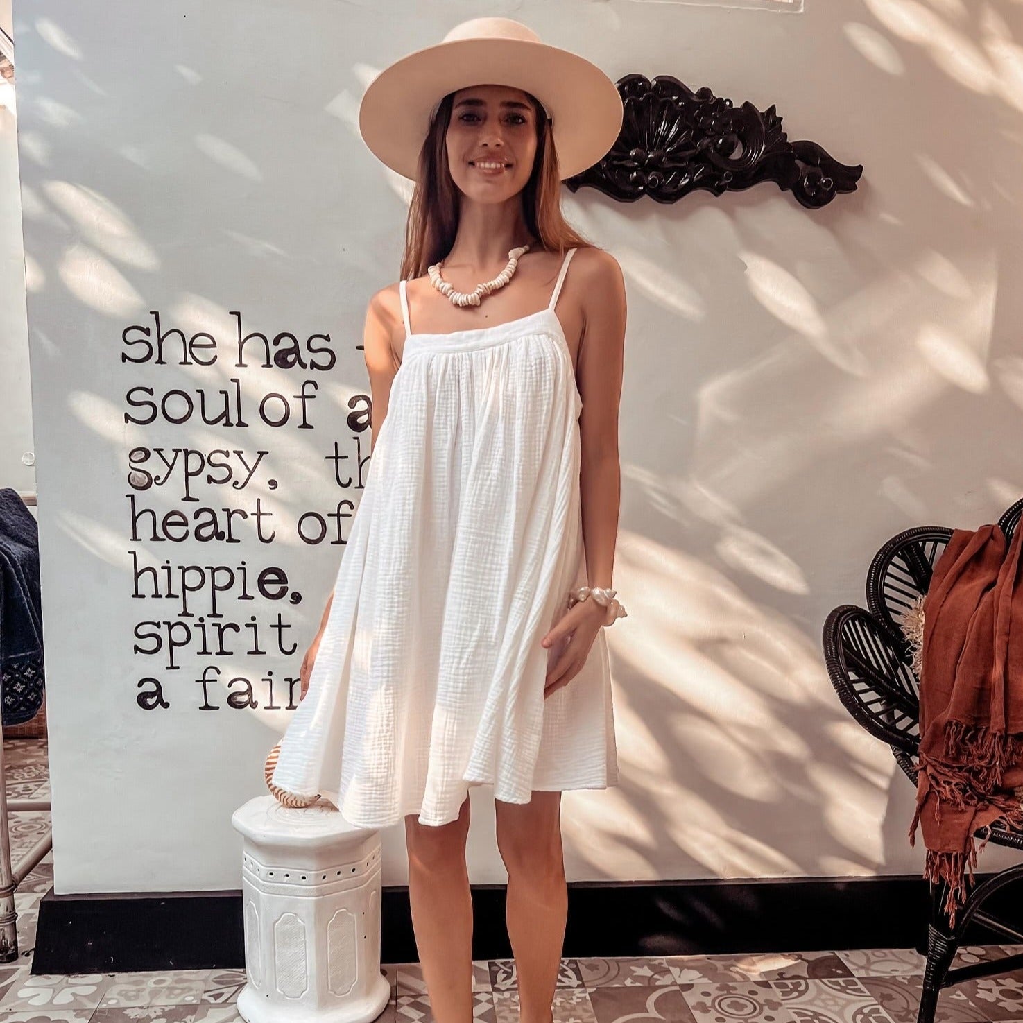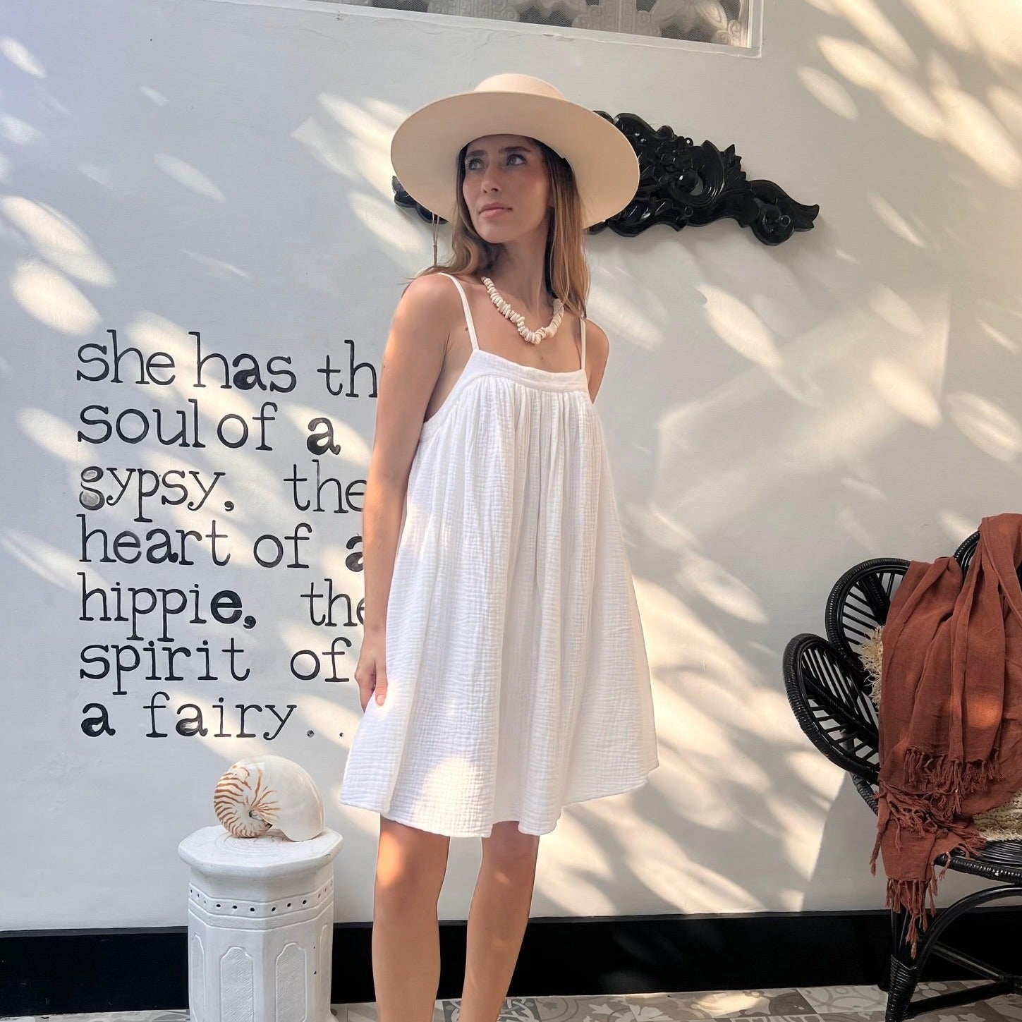 Discover our effortless new mini dress, made for beach side sojourns and endless summer days. The Bay Mini Dress has a square, modest neckline that tapers down around the sides and back. A perfect, flowy beach coverup or chic summer dress.
