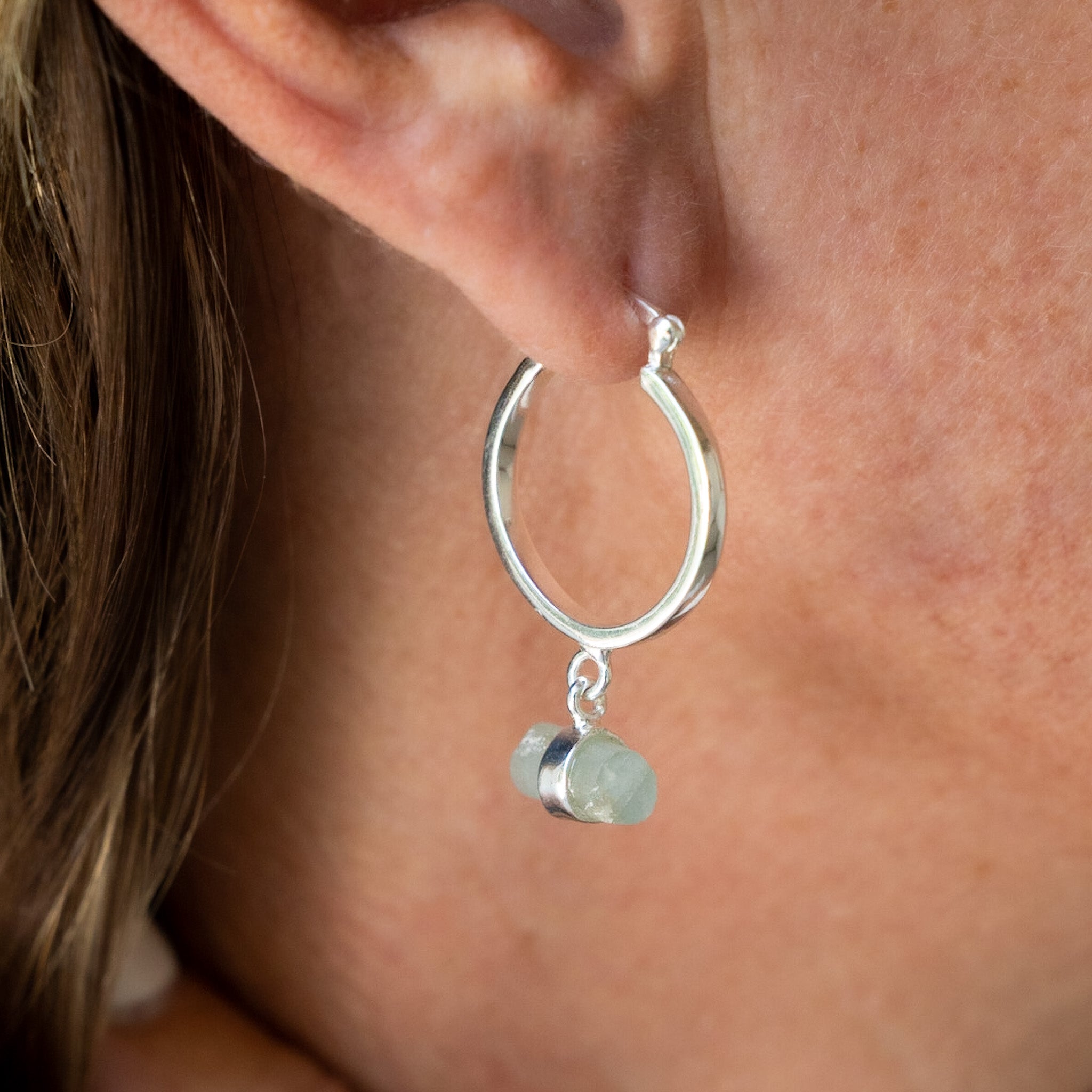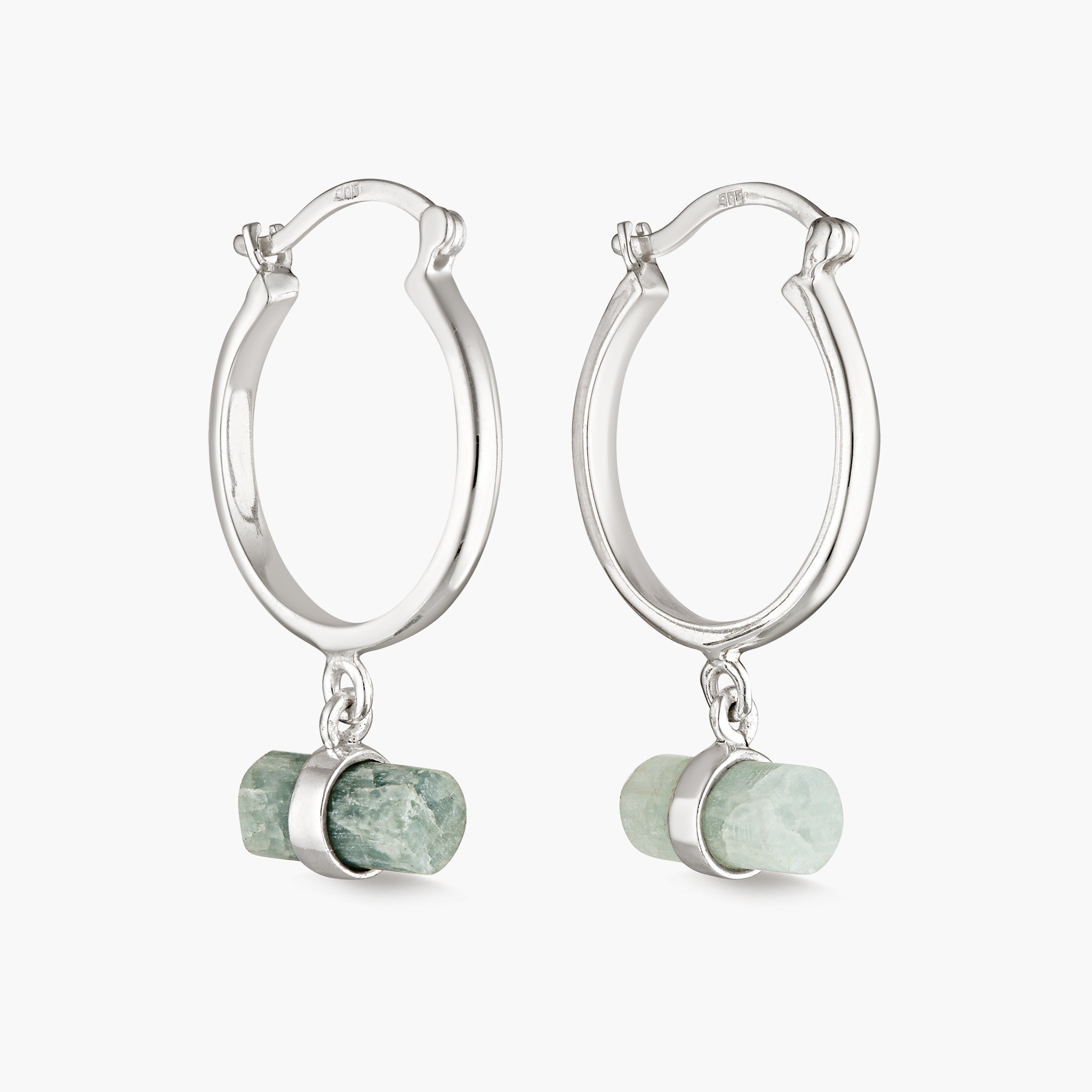 Handcrafted from sterling silver, discover the raw-cut Aquamarine Lola Hoops. Aquamarine helps to channel the artist within, promoting creativity and self-expression while bringing calmness to its wearer. This style offers a 19mm hoop and a 10mm drop stone.