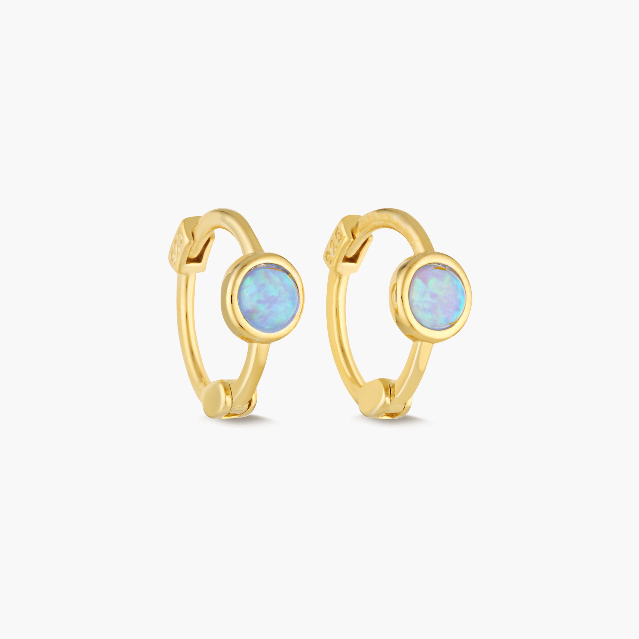 Soft iridescence, close to the skin. A luminous blue opal is set directly along the curve of these gold-plated sterling silver huggies, catching the light with subtle flashes of colour. Delicate yet distinctive, they bring a gentle glow to your everyday stack. Refined, effortless and quietly radiant.