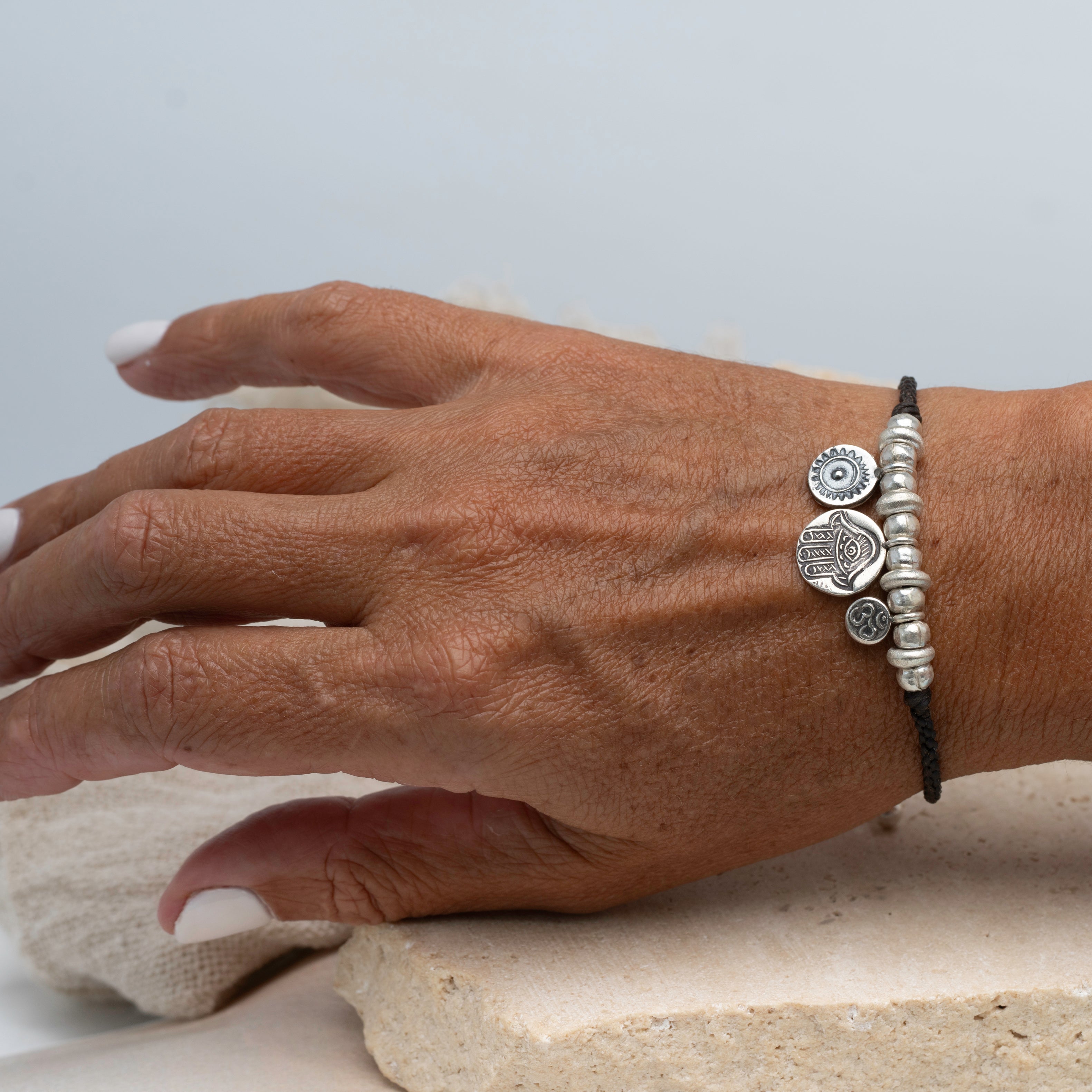 Introducing the Hamsa Bracelet, a meaningful accessory that combines elegance and spirituality. Crafted with durable Polywax cotton thread, this bracelet is adorned with Hilltribe silver beads and secured with a sterling silver clasp for a touch of refined quality.