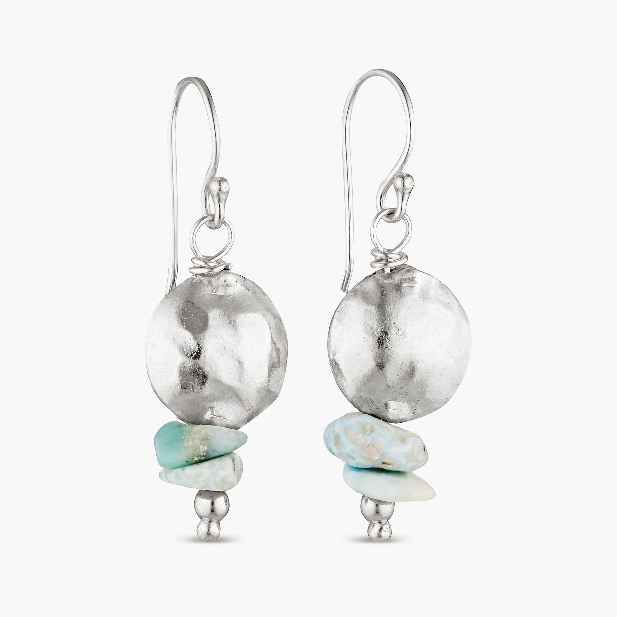 Reflect the beauty of clear blue waters with our Larimar Mirror Drops. These earrings feature sterling silver ear hooks for comfortable wear. The focal point of the earrings is the Larimar chips, coupled with the hand-hammered hilltribe silver charm, adding a touch of artisanal elegance. Larimar is known for its calming and soothing properties, making these earrings not just a fashion statement, but also a source of peace and relaxation.