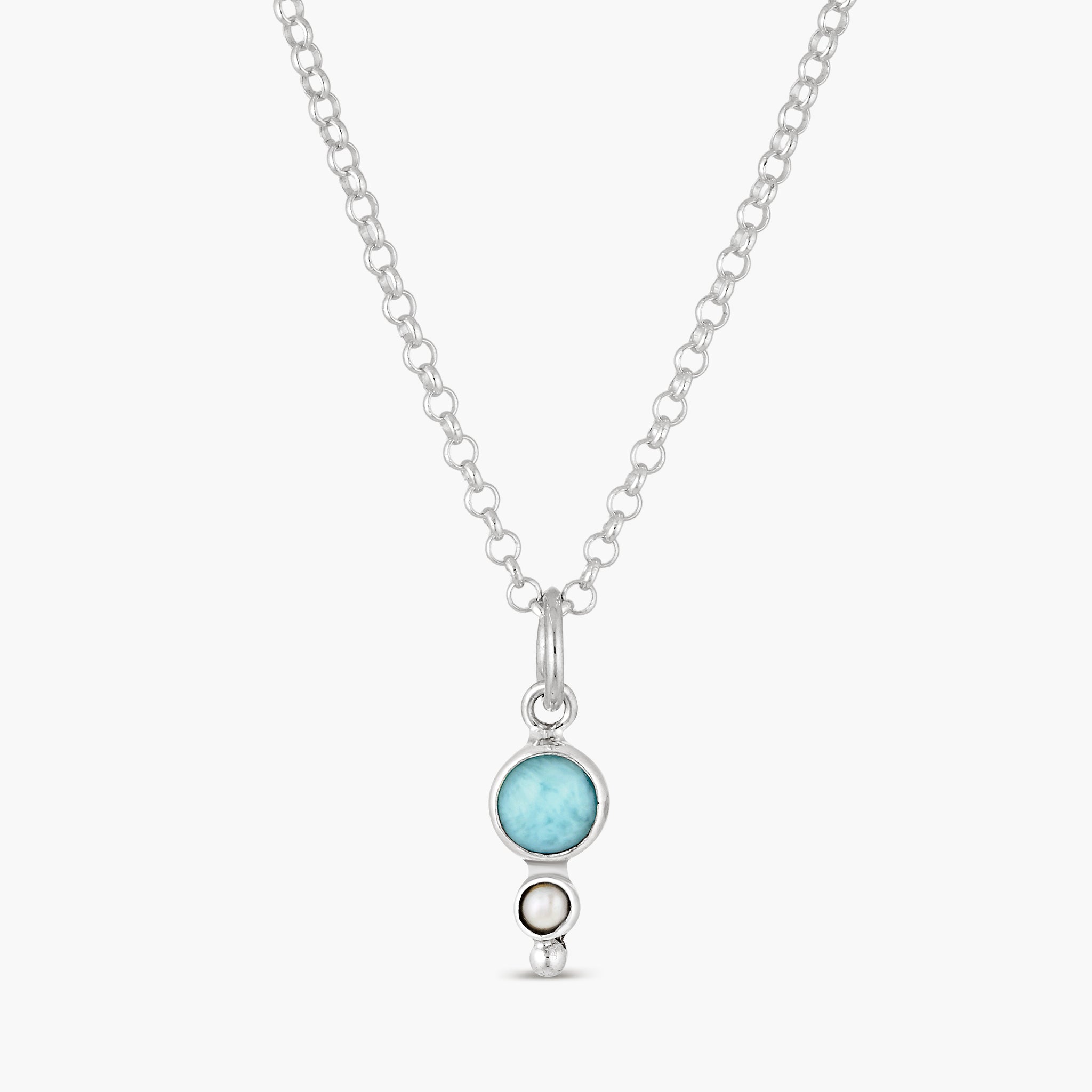 Ocean light, softly layered. A tumbled larimar stone is set in sterling silver, paired with a delicate pearl suspended just below — creating a gentle play of blue and luminous white. Each larimar carries its own natural variations, echoing the shifting tones of clear Caribbean waters.