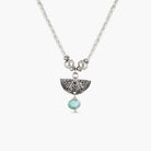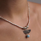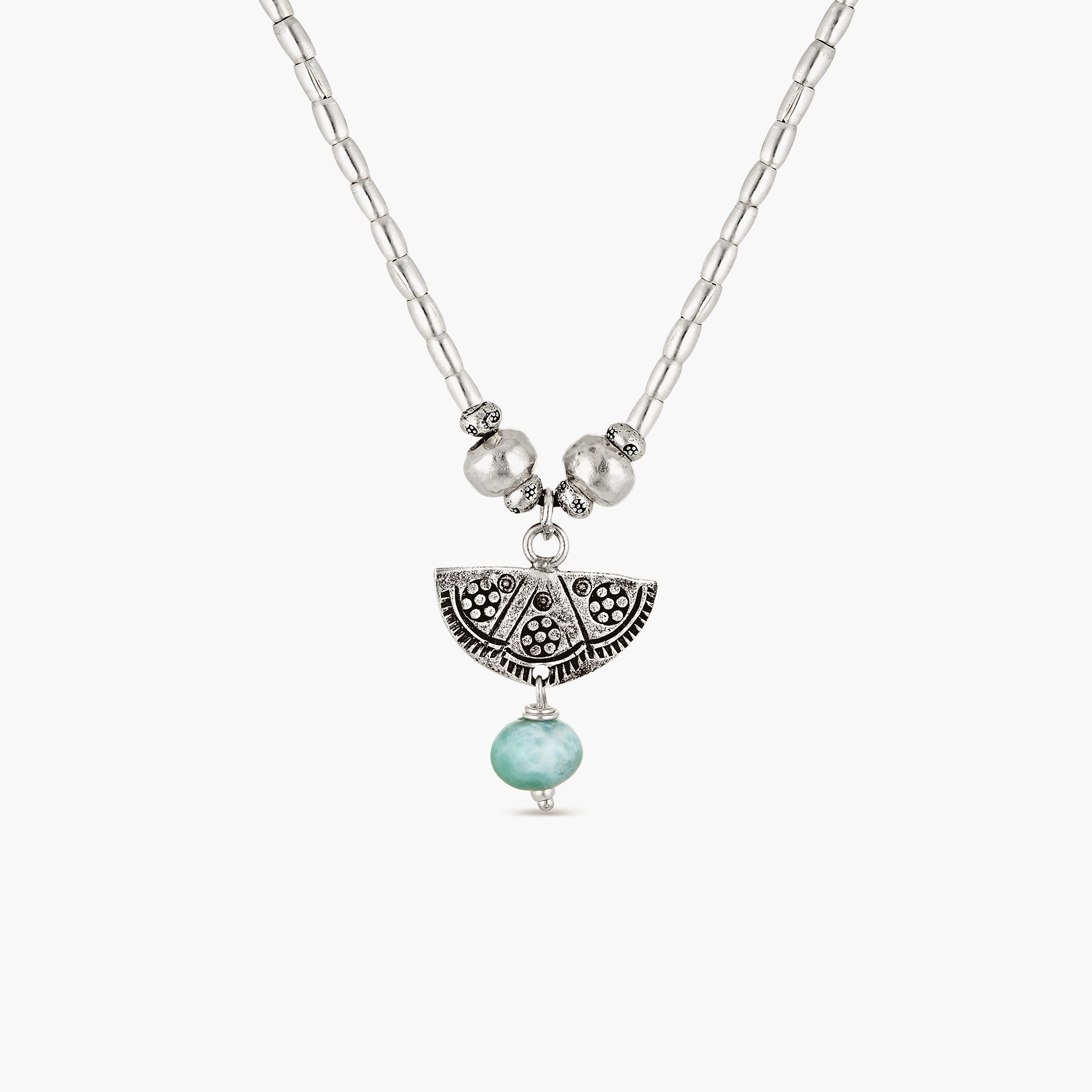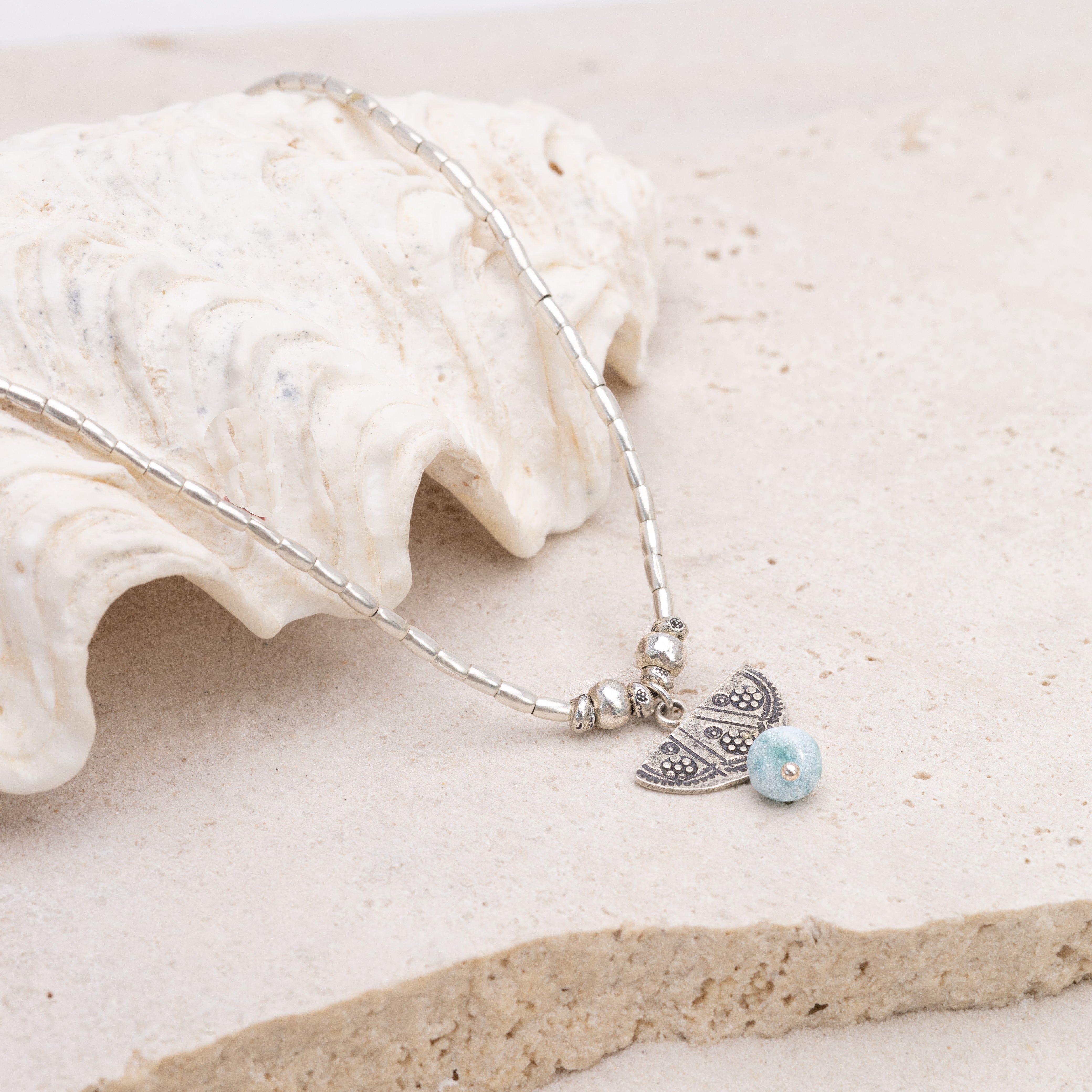 It's back, the Larimar Little Dahlia Necklace is back by popular demand. Crafted from hill tribe silver, this necklace features our signature Dahlia fan pendant with a beautiful piece of tumbled larimar. Linked to the throat chakra, larimar is believed to help express thoughts and emotions with confidence and clarity.