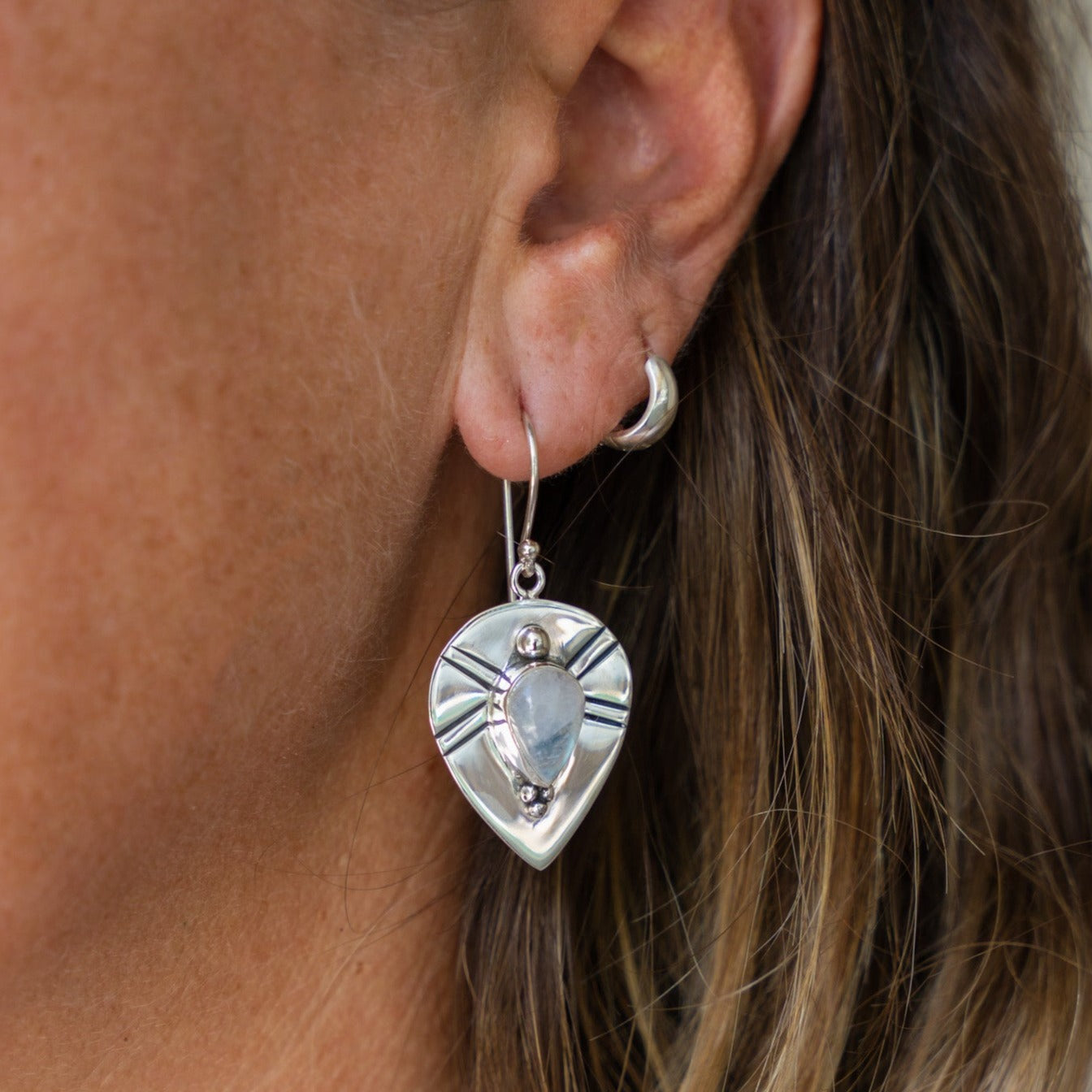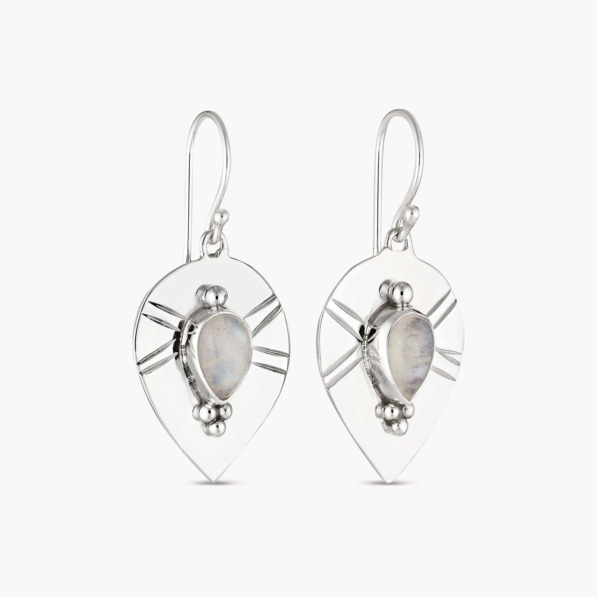 Handcrafted from sterling silver, the Moonstone Sanna Drops feature an enchanting drop pendant with a teardrop, opaline moonstone set in the centre. Taking power from its namesake, the moonstone is associated with spirituality, femininity, and intuition.