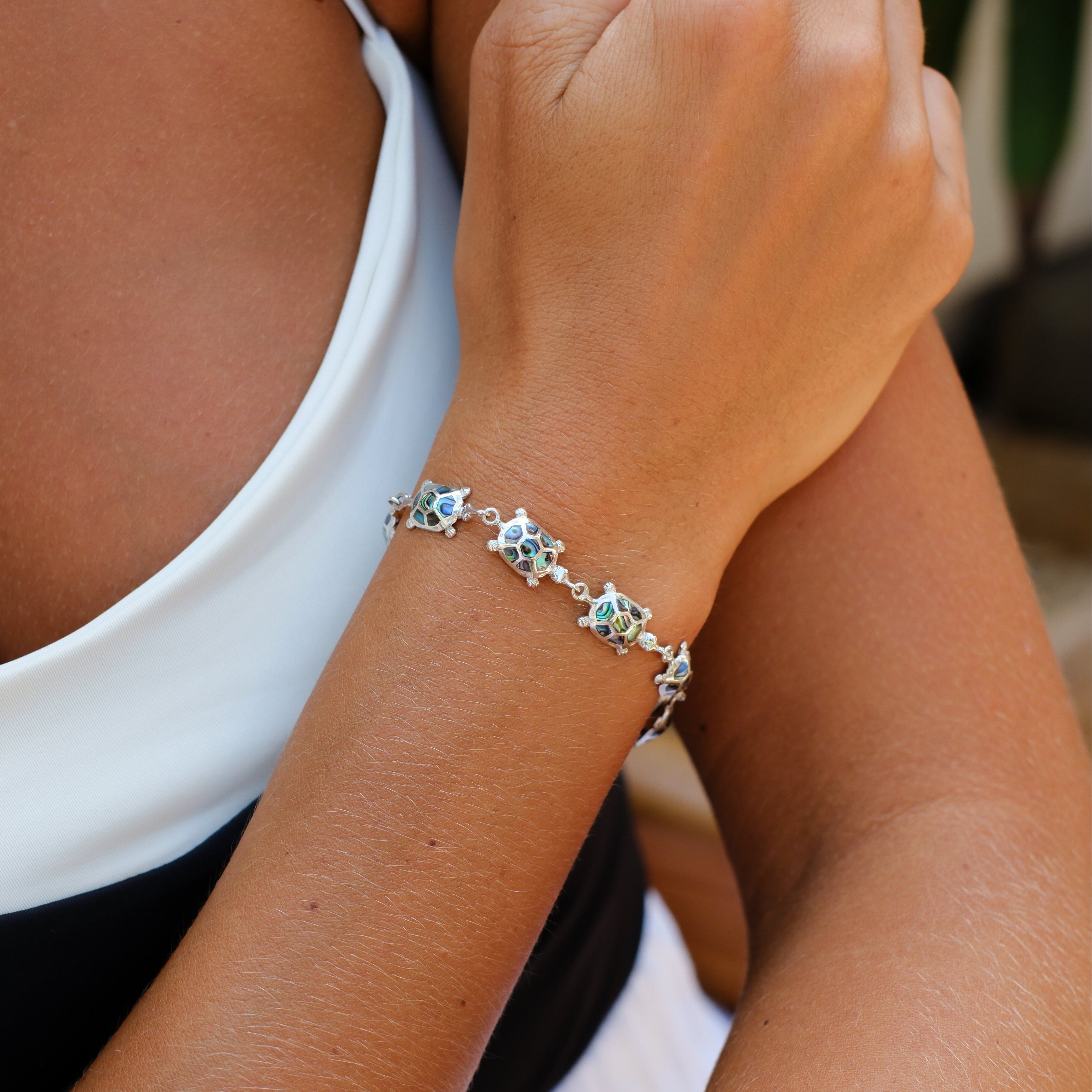 A tribute to the ocean and its gentle guardians, the Paua Turtle Bracelet is crafted from sterling silver and adorned with delicate turtle charms, each featuring a luminous paua shell inlay that forms their shells. Rich in iridescent blues and greens, paua shell reflects the ever-changing beauty of the sea.