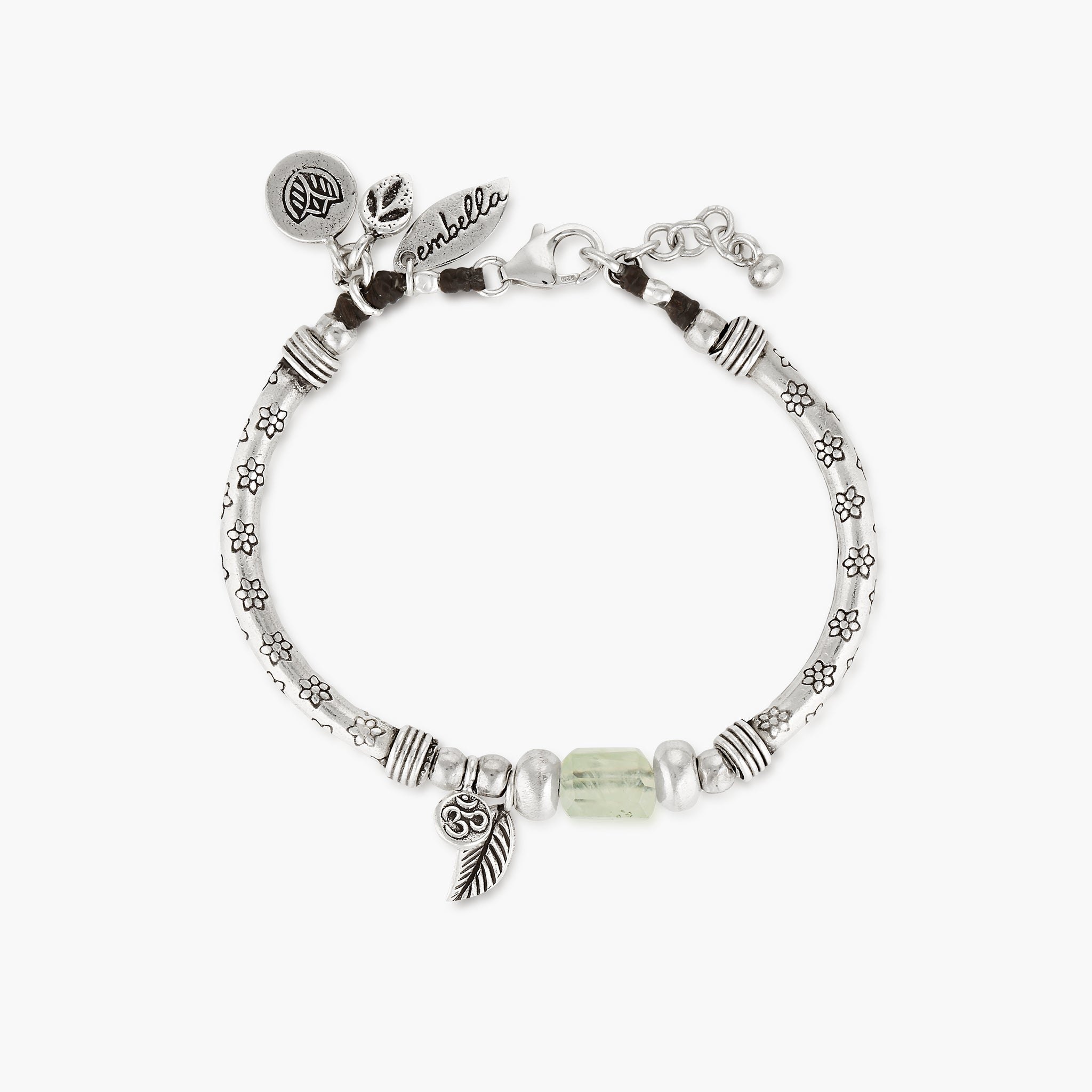 Introducing the Prehnite Spring Bracelet, a beautiful celebration of spring's blossoming gardens. Crafted from Hilltribe silver on durable Polywax cotton thread, this bracelet features a soothing prehnite bead, known for its ability to enhance intuition and bring peace and protection. Adorned with Hilltribe silver charms, including leaf, lotus, and Om symbols, along with intricately engraved flower beads, this bracelet captures the essence of nature's renewal and tranquility. Secured with a sterling silver parrot clasp, it ensures both style and durability.