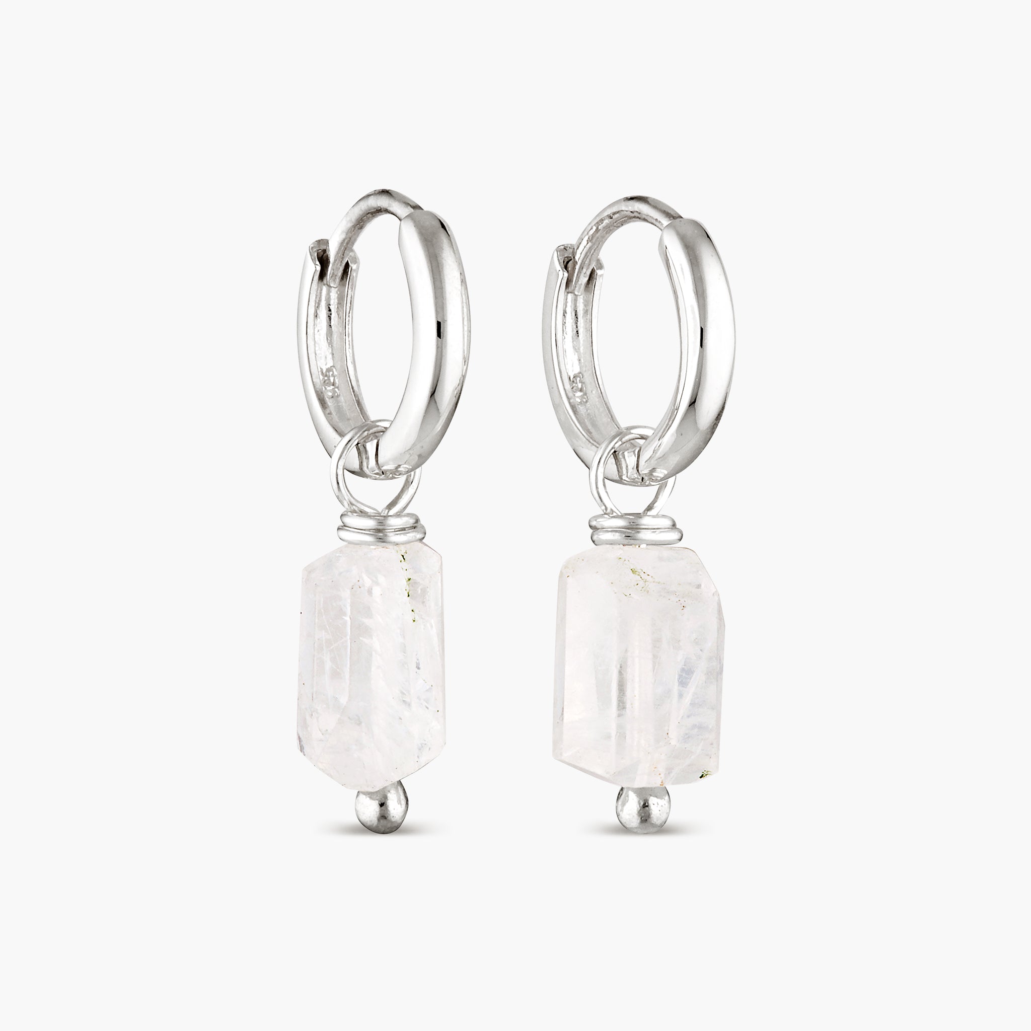 Embrace the intrinsic power of our Rising Moonstone Huggies. These beautiful, handcrafted sterling silver earrings feature a drop faceted moonstone. Believed to be an emotional healer, moonstone can promote spiritual growth and intuition.