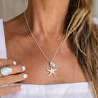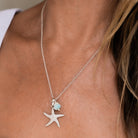Get ready to make a splash with our Starfish Pendant featuring a stunning Larimar drop. Crafted from sterling silver, this playful pendant is paired with a delicate chain and a cut shell for a touch of seaside charm. Embrace your inner ocean lover with this unique piece!