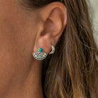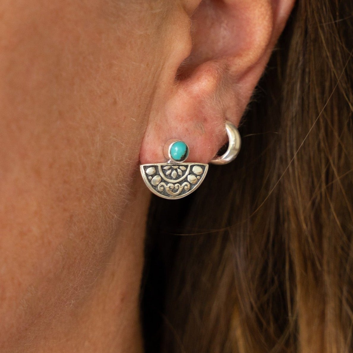 The Turquoise Dahlia Studs symbolise inner strength and the journey to enlightenment. Crafted from sterling silver, these studs feature a tumbled turquoise with a traditional fan shape underlay, patterned by flowers and swirling details. Turquoise is a beautiful blue stone, each one uniquely different; it is said to be a powerful protector, providing peace and serenity to the wearer.