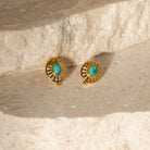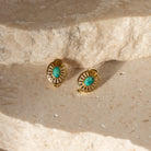 Welcome our Turquoise Hathor Gold Earrings from the all-new Soleil collection, a stunning tribute to ancient Egyptian jewellery. These elegant earrings are crafted from lightweight, 18k gold-plated stainless steel, ensuring they are waterproof and durable. Each earring features a beautiful turquoise pendant, a stone revered in ancient Egypt for its protective and healing properties. Turquoise symbolised health, wisdom, and spiritual grounding, making it a cherished gemstone in Egyptian culture. These studs have flat backs for the most comfortable wear.
