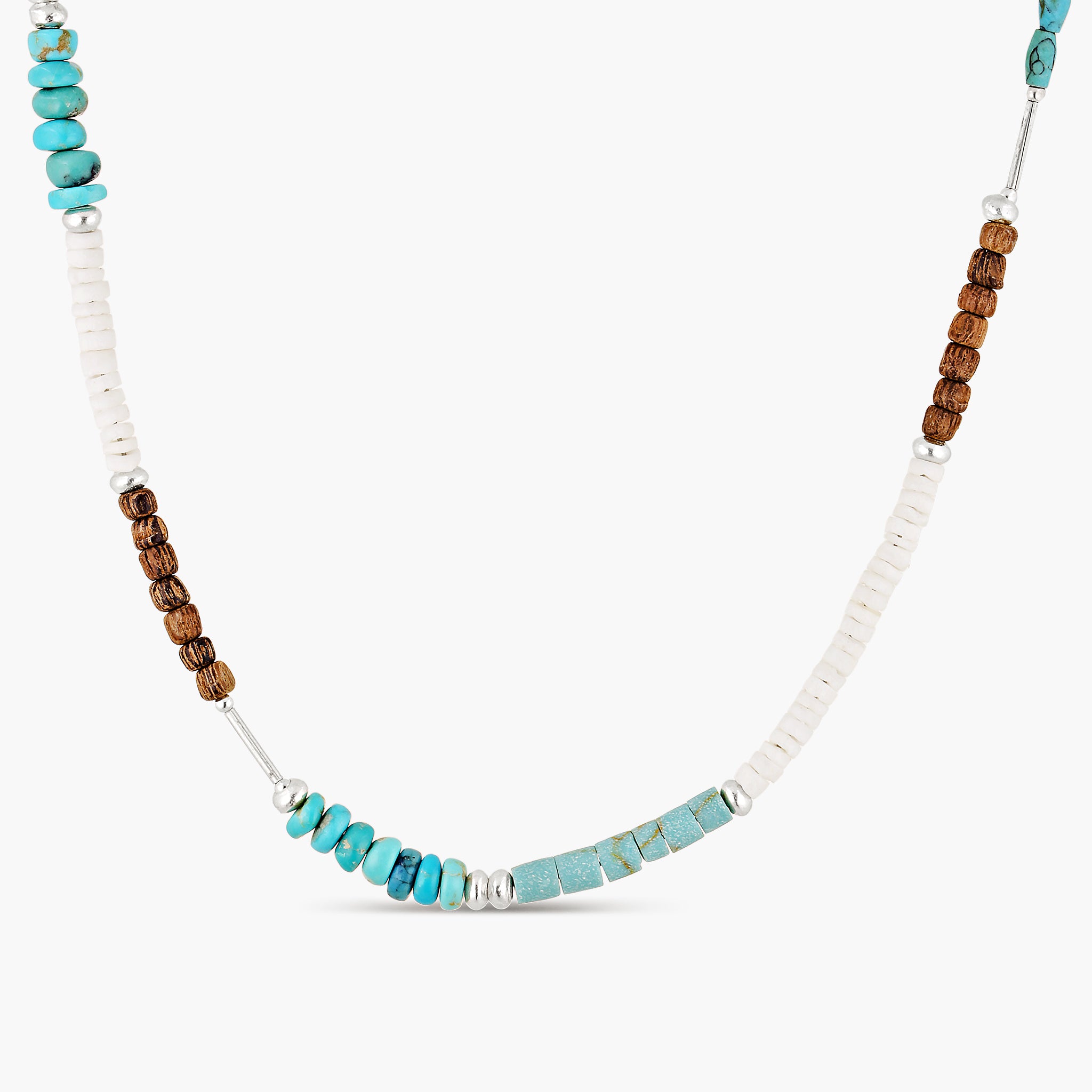 The Turquoise Ibiza Choker is a handcrafted, limited-edition piece from our Rituals Collection, designed for effortless layering and everyday intention. Made with a considered mix of turquoise, reconstituted turquoise, coconut beads, cut shell, and Hill Tribe silver spacer beads on a fine tigertail base, it brings together natural texture and coastal colour. Worn alone or layered, we love it paired with the Turquoise Ibiza Huggies—a grounding piece that captures the spirit of sun-washed days and slow, intentional rituals.